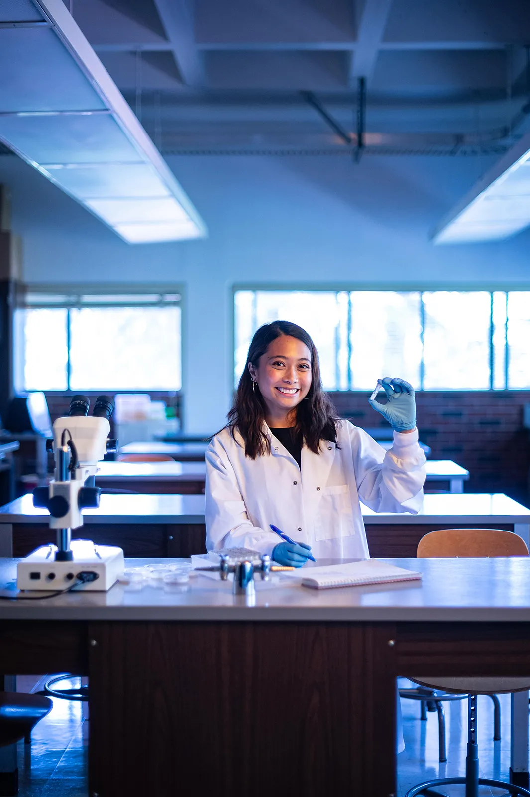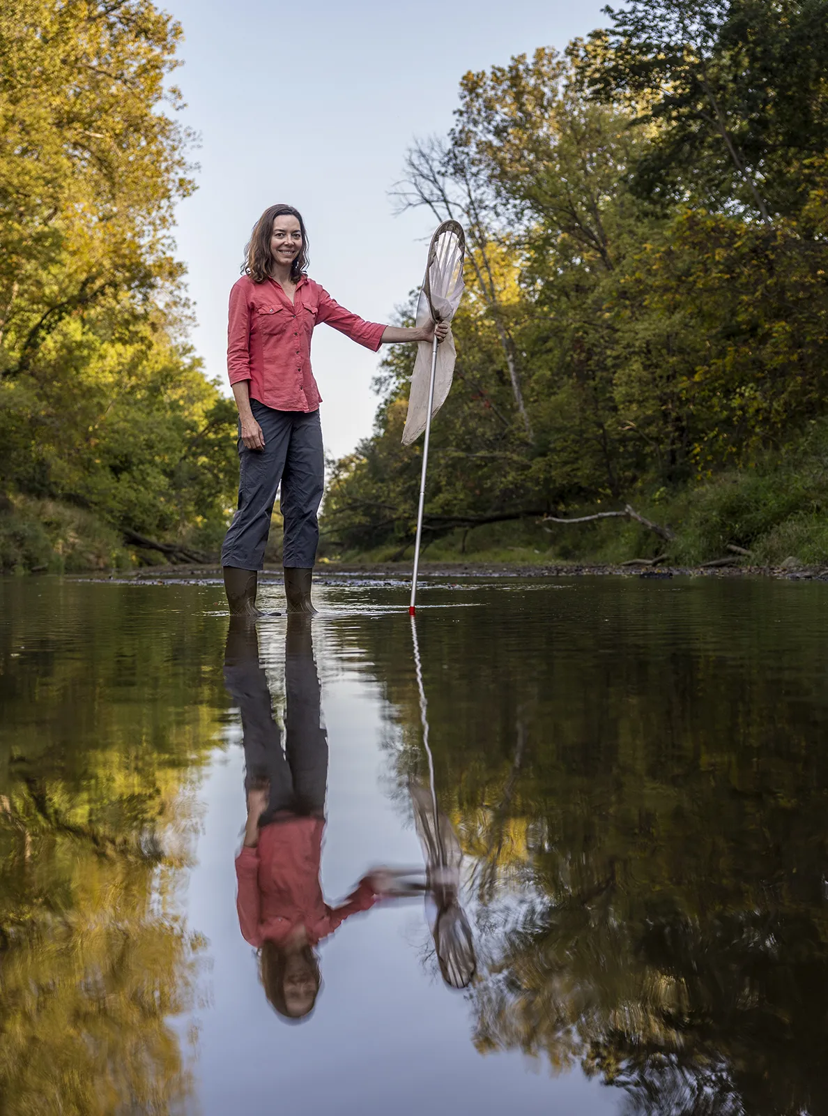 Idelle Cooper, Assistant Professor Biology, poses for a portrait in the North Skunk River where she has been collecting Damselflies for her research.