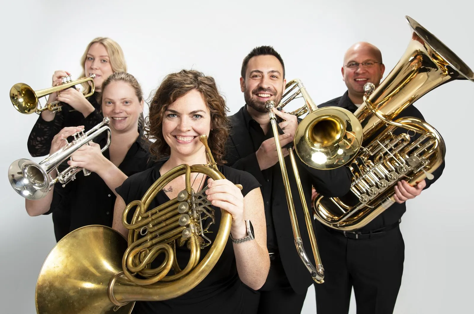 The Lamoine Brass Quintet poses for a group photo in the studio.