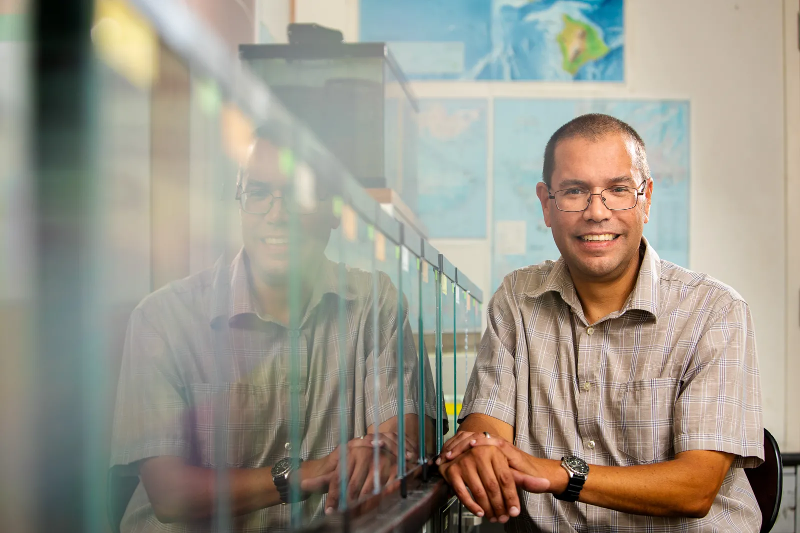 Maui native and UB researcher Scott Santos has been studying Halocaridina rubra, or tiny red shrimp, for nearly two decades. He poses with the shrimp tanks in his lab in Hochstetter Hall.