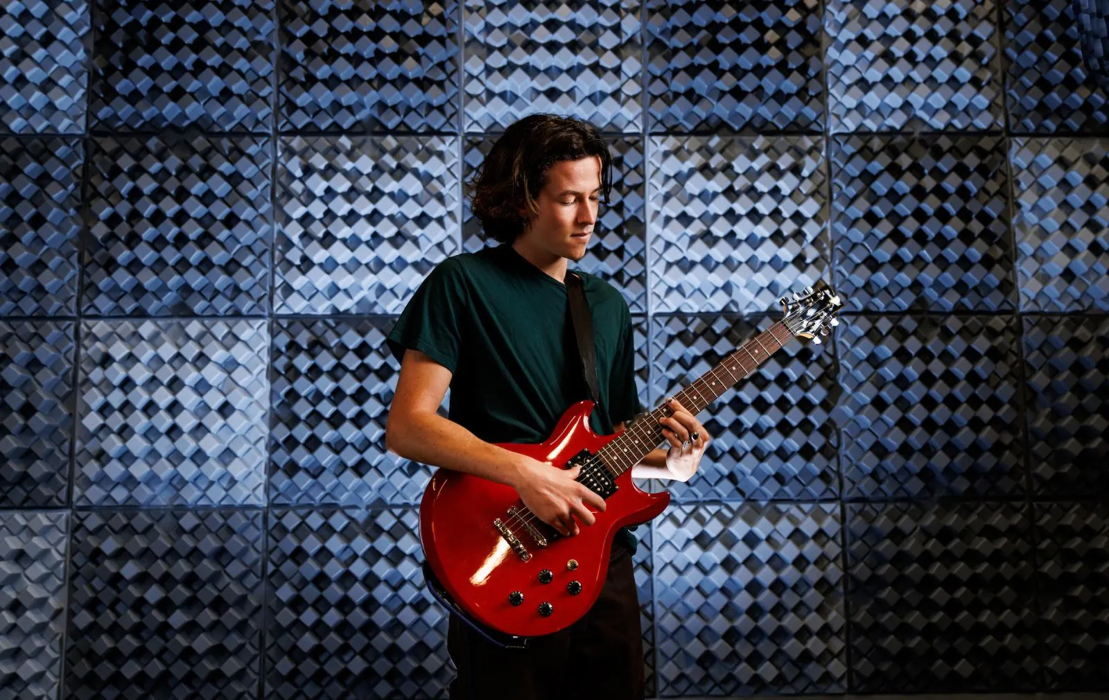 Student Aiden Dillon experiments with sound in front of acoustic paneling inside the university's new Expressive Technology Studio.