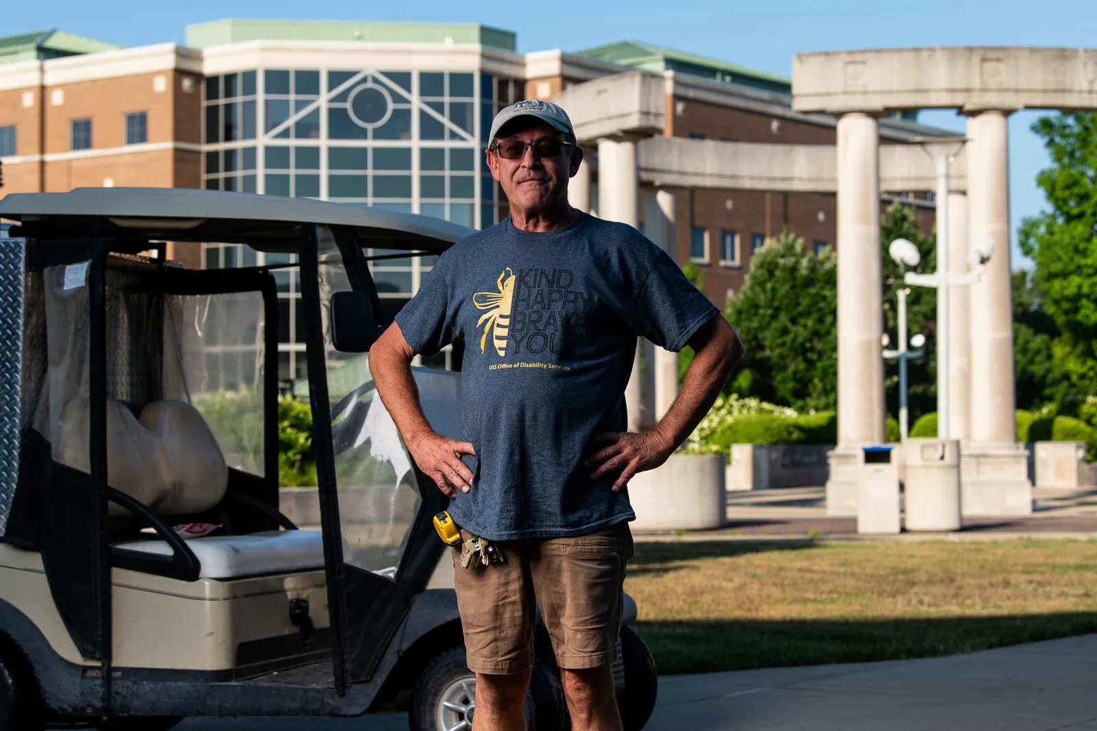 Neville Patkus, with his trusty golf cart, has spent more than 7 years traipsing the campus fixing all sorts of problems as the Campus Carpenter Foreman. This photo is a part of an occasional portrait series of whichever facility personnel the photographer can convince to stand in for a lighting test.