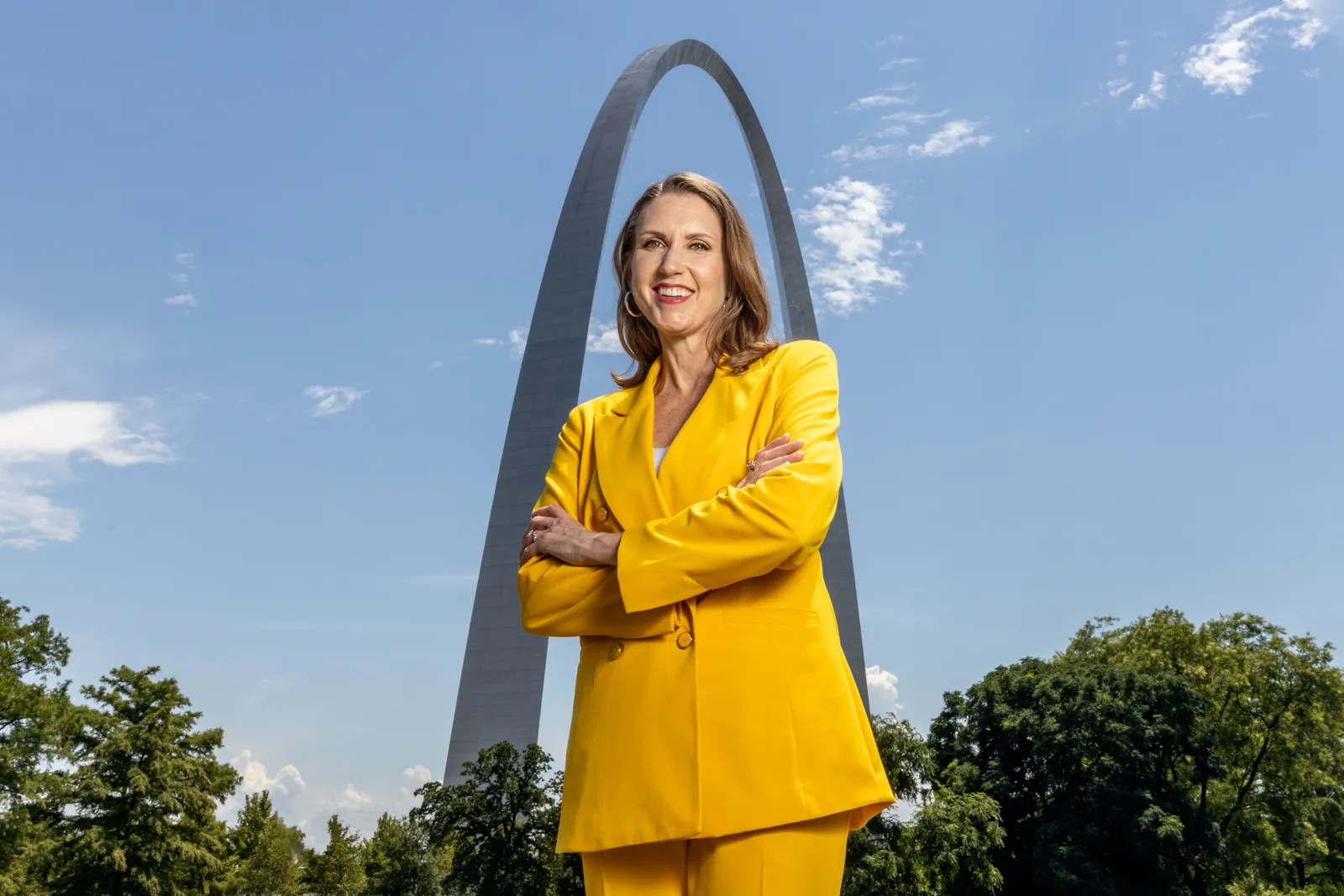 Mindy Mazur is the incoming Alumni Association President. There were several photos taken on campus, but her hometown is near St. Louis and she currently works in St. Louis. It's also a strategy of the Alumni Assoc. this year to work on the St. Louis market. So it made sense to get her portrait by the Gateway Arch.