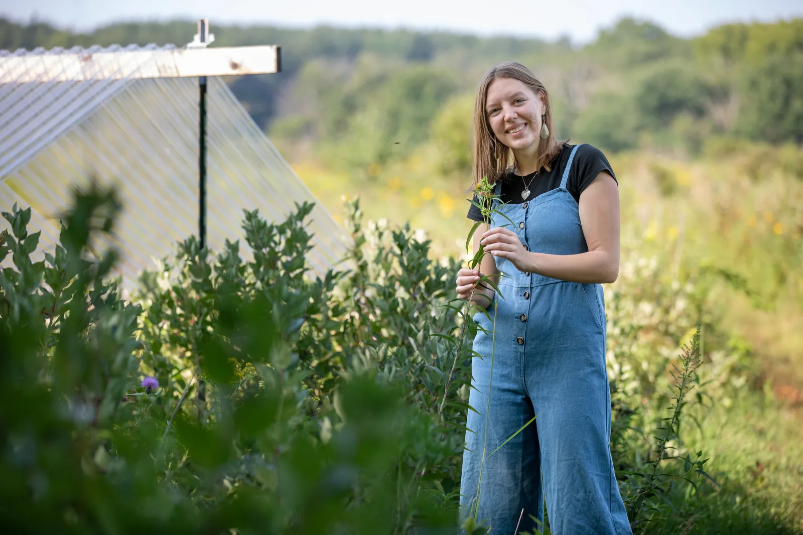 Rosalie Powell poses for a portrait next to a rainout shelter in the Curtis Prairie at the UW Arboretum in Madison, Wis., Thursday, Aug. 24, 2023. Powell was involved in a research project using the shelters to simulate drought.