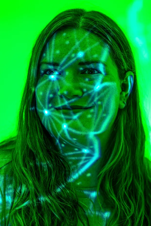 Ashley Knehans poses for a portrait with a projector, simulating the green screen she works with on Thursday, July 17, 2023. The 2021 University graduate works as a visual effects and computer graphics artist for Zero VFX, a Boston-based company that has worked on a slew of major motion pictures and national TV commercials including "I Wanna Dance with Somebody," "Gran Turismo," "Ma Rainey's Black Bottom" and "Patriots Day". She studied visual effects and animation while also a member of the university's Division I rowing team.