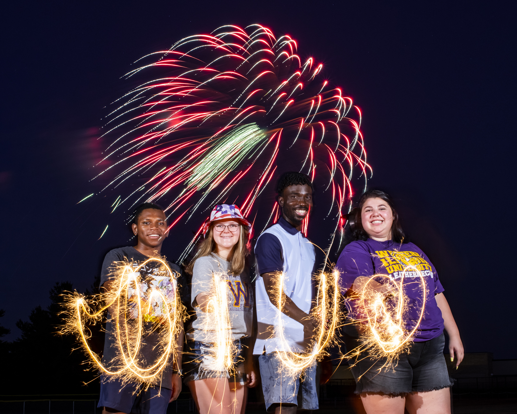 Students pose and write with sparklers during the annual 4th of July firework celebration to help create an in-camera, long-exposure group photo.