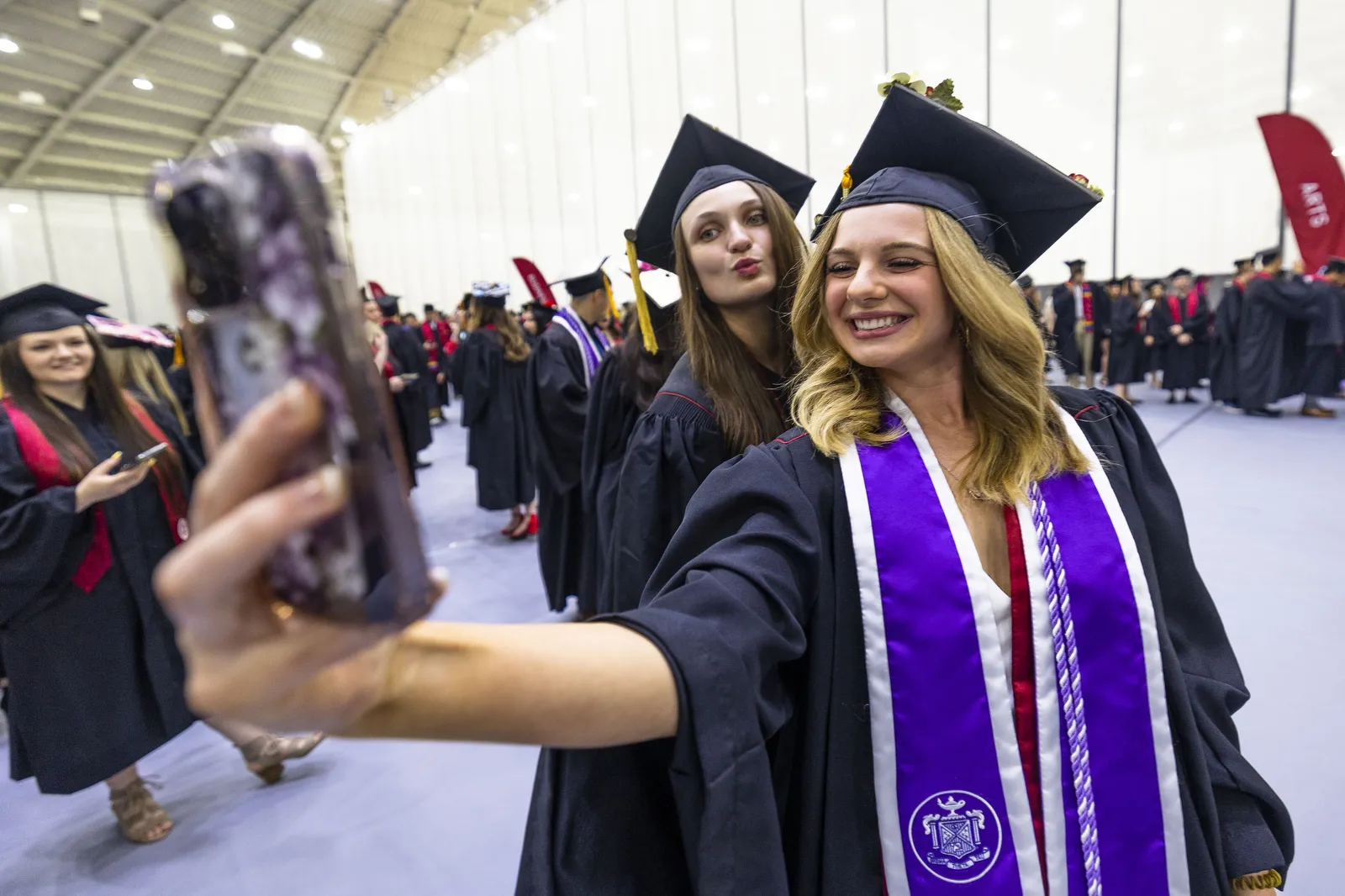 Graduates take a selfie during the IU South Bend commencement Tuesday, May 9, 2023, at the Joyce Center in South Bend.