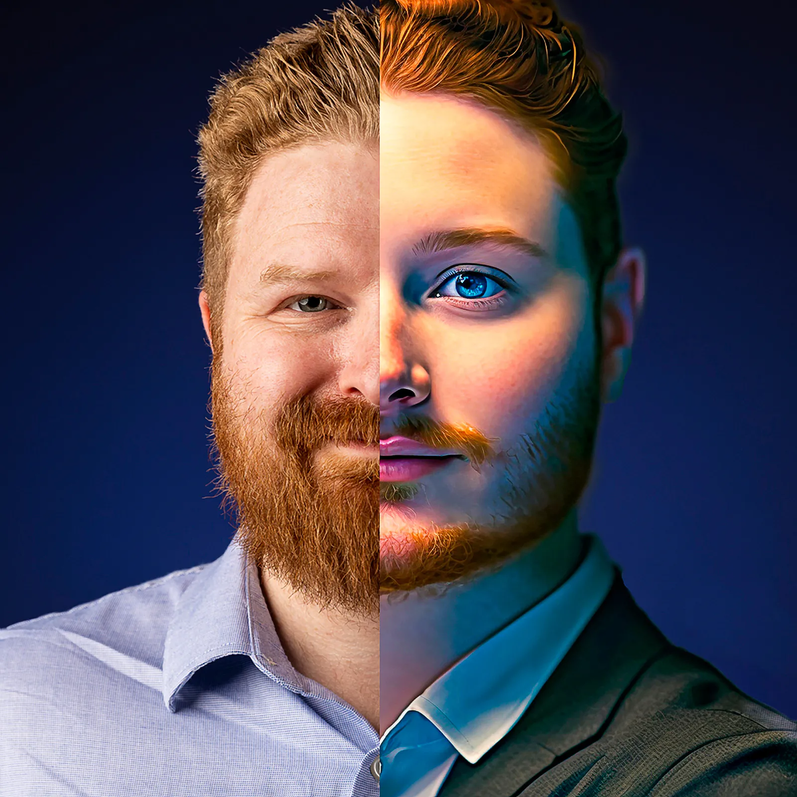 Doug Hamilton, the head of AI Research for Nasdaq, returned to his alma mater to give two lectures on the state of artificial intelligence in the middle of April. The left side of the photo is straight photographic imagery. The right side of the photo is an image to image composite photo based on seven previously existing photos of Mr. Hamilton.