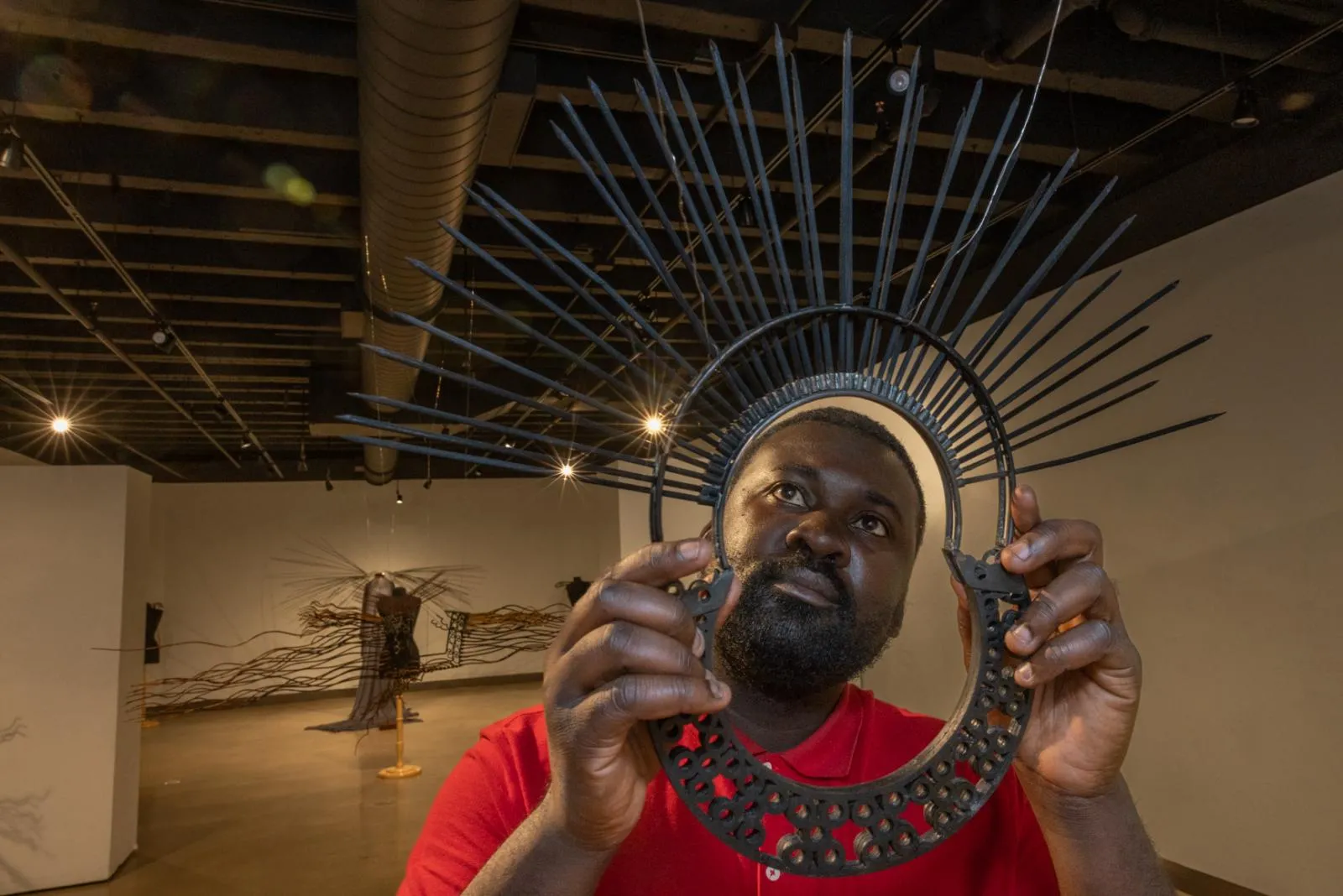 Glover Marfo, MFA student, hangs one of his art pieces for his final thesis exhibition. His work is based on African vernacular designs which are wearable and represent universal gender and economic inequalities, while entertaining cross-cultural influences of his lived experiences.