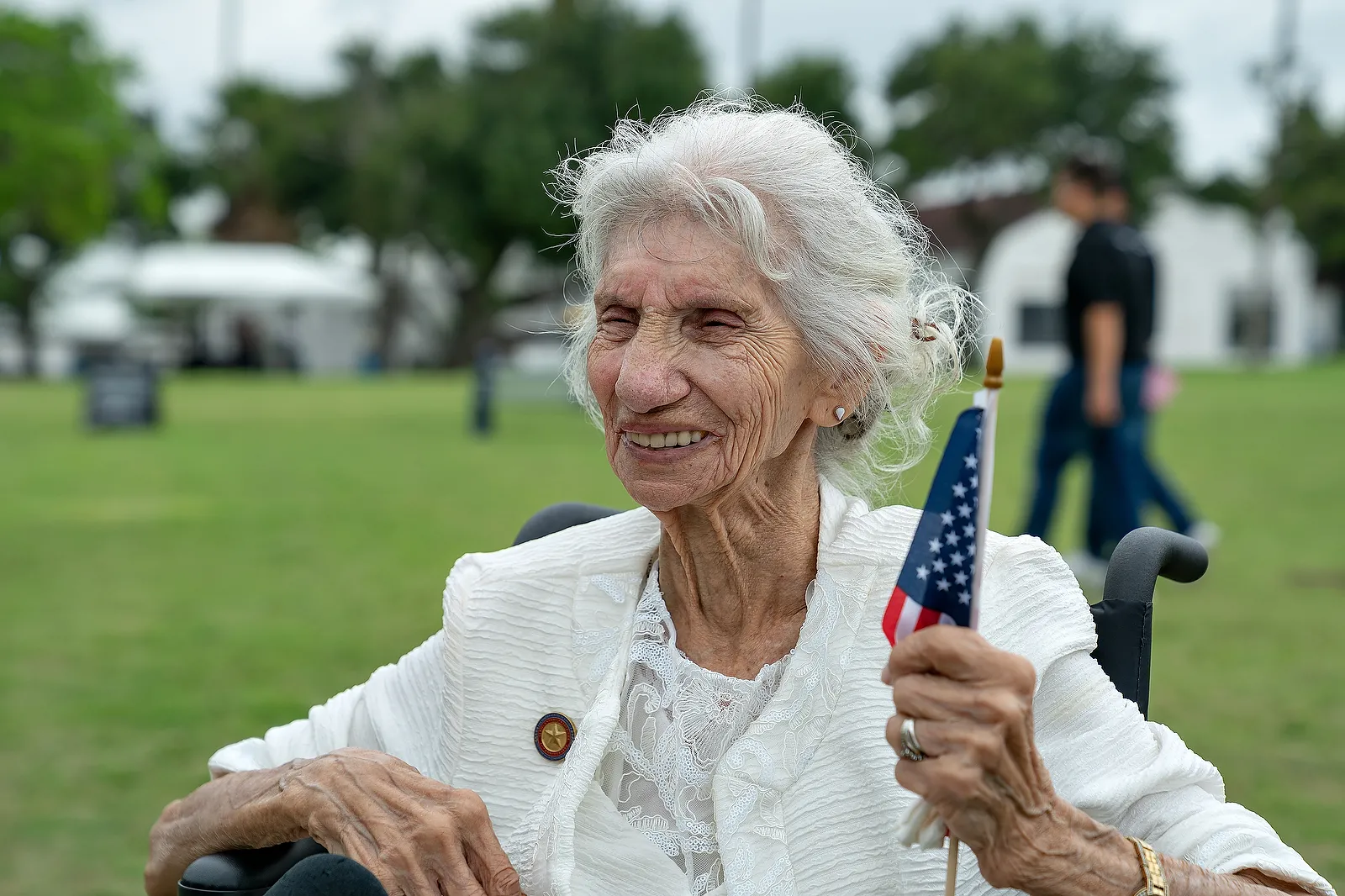 Dolia Gonzalez, Vietnam Gold Star mother, speaks about the Welcome Ceremony for The Wall That Heals, a traveling Vietnam veterans memorial replica sponsored by the university and the city on Thursday, April 20, 2023.