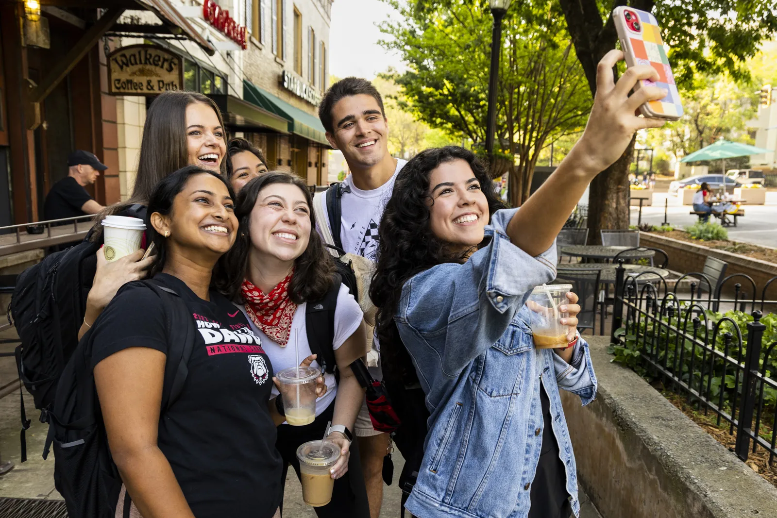 A group of UGA students pose for a selfie in downtown Athens outside a local coffee shop across from campus.