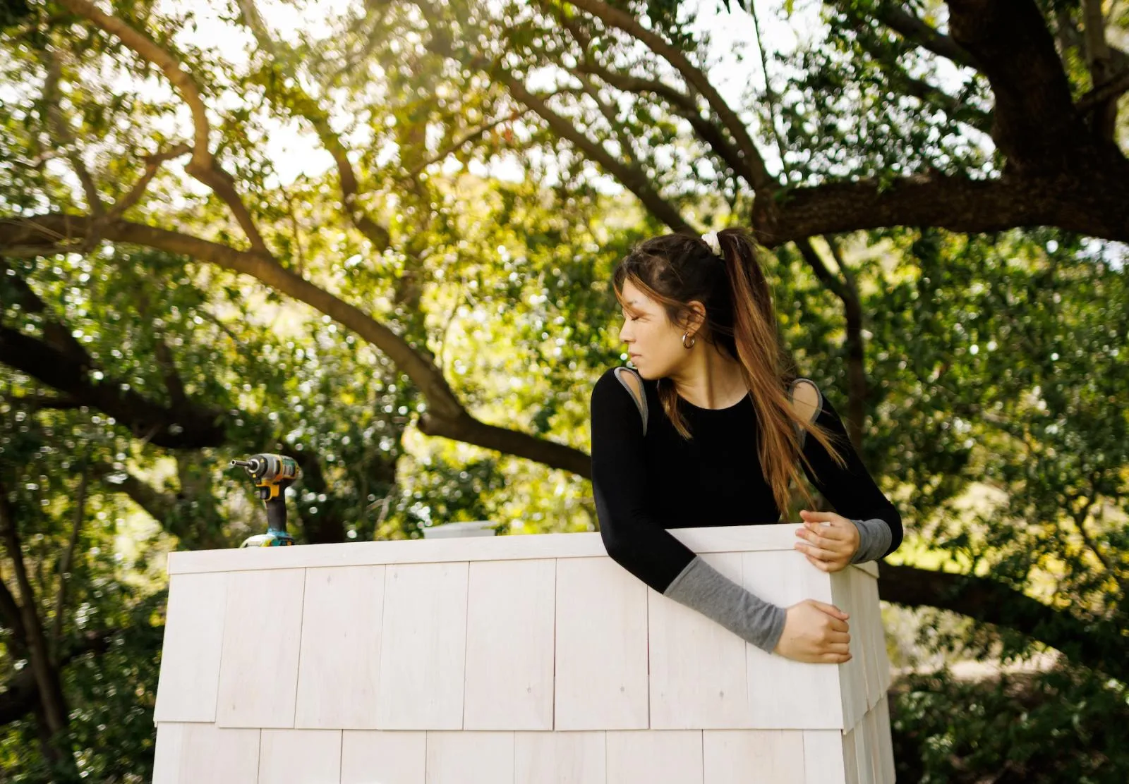 An architecture student pauses for a moment as she works on building a temporary structure at the university's outdoor experimental construction laboratory.