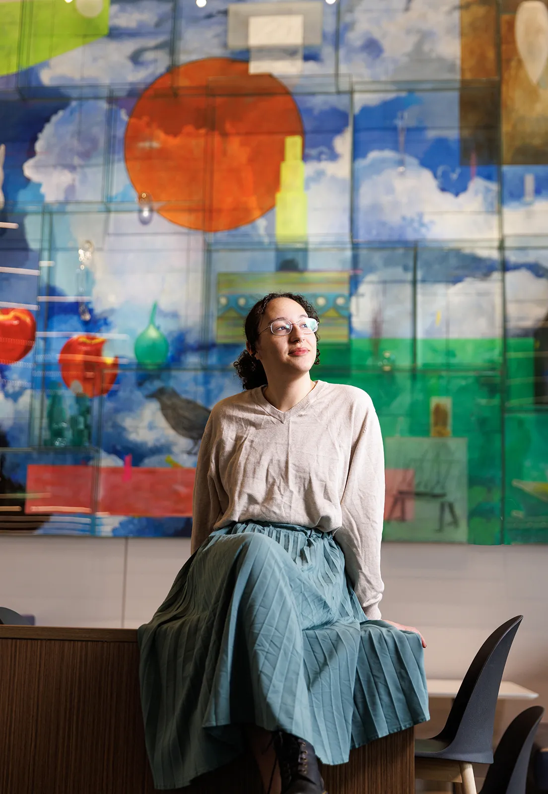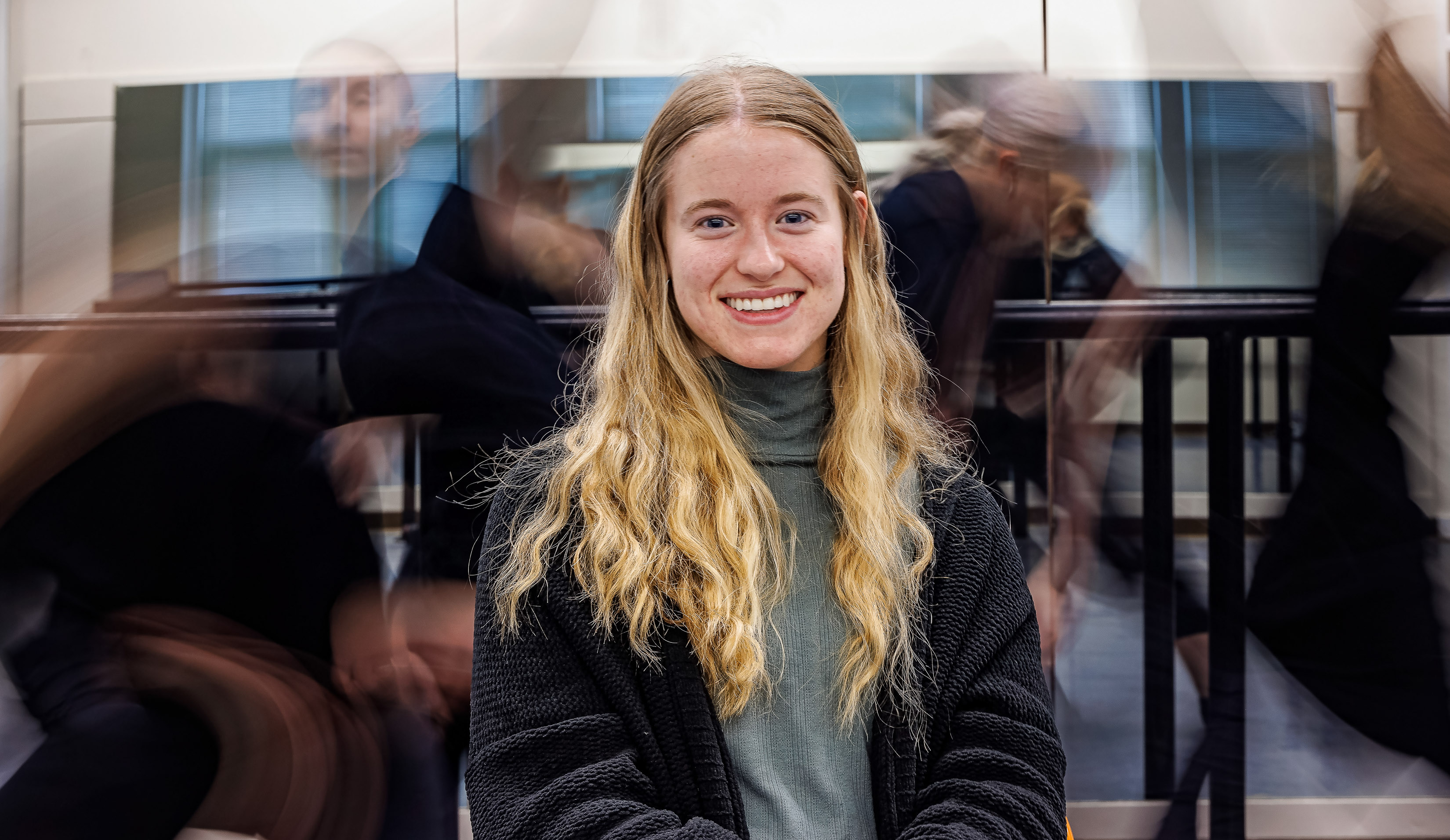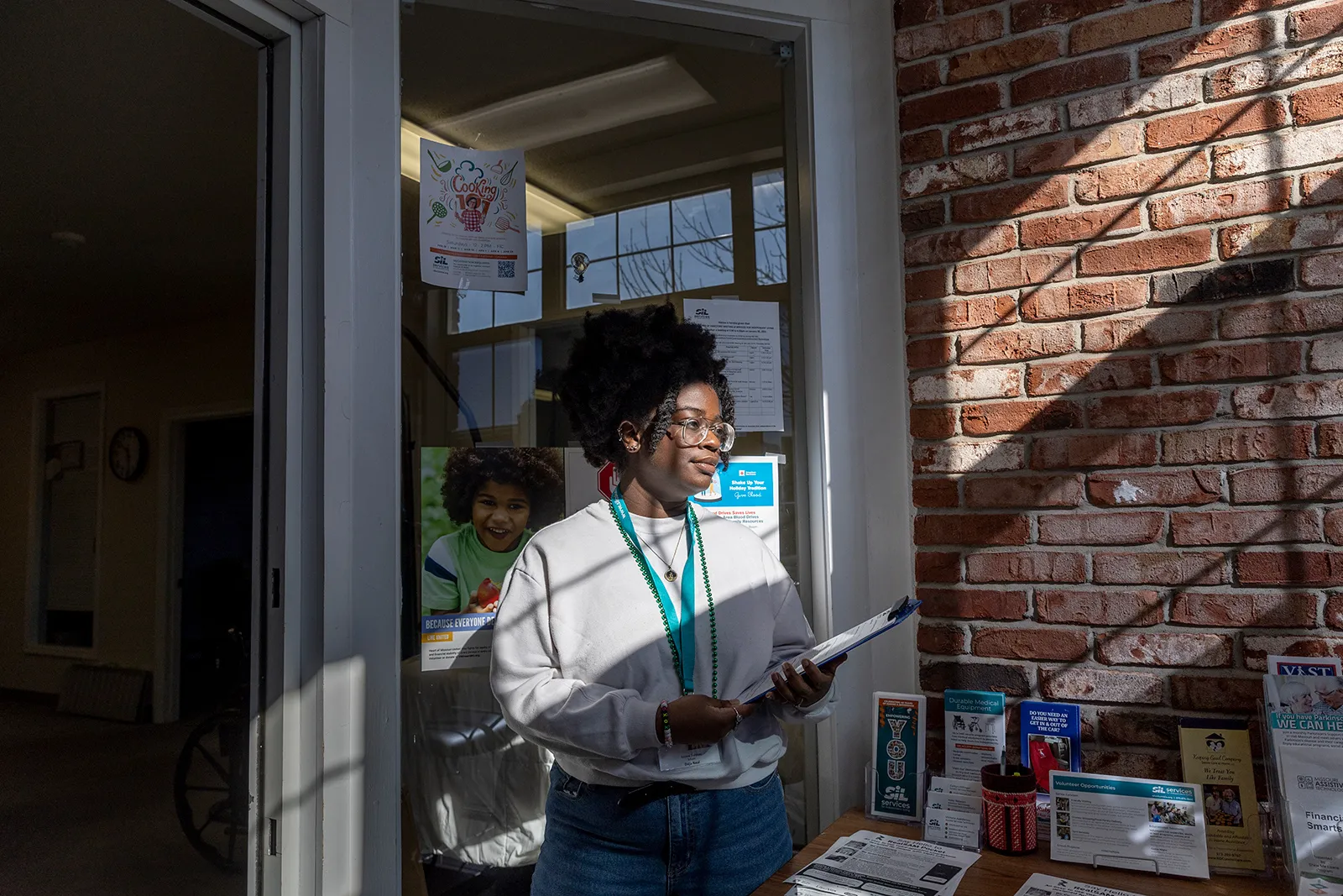 Daja Neal is a first-year occupational therapy student intern at Services for Independent Living. She stands in the doorway as she waits for clients to arrive during her shift.