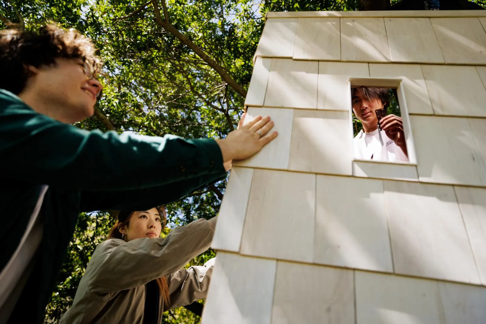 Architecture students work on building a temporary structure at the university's outdoor experimental construction laboratory.