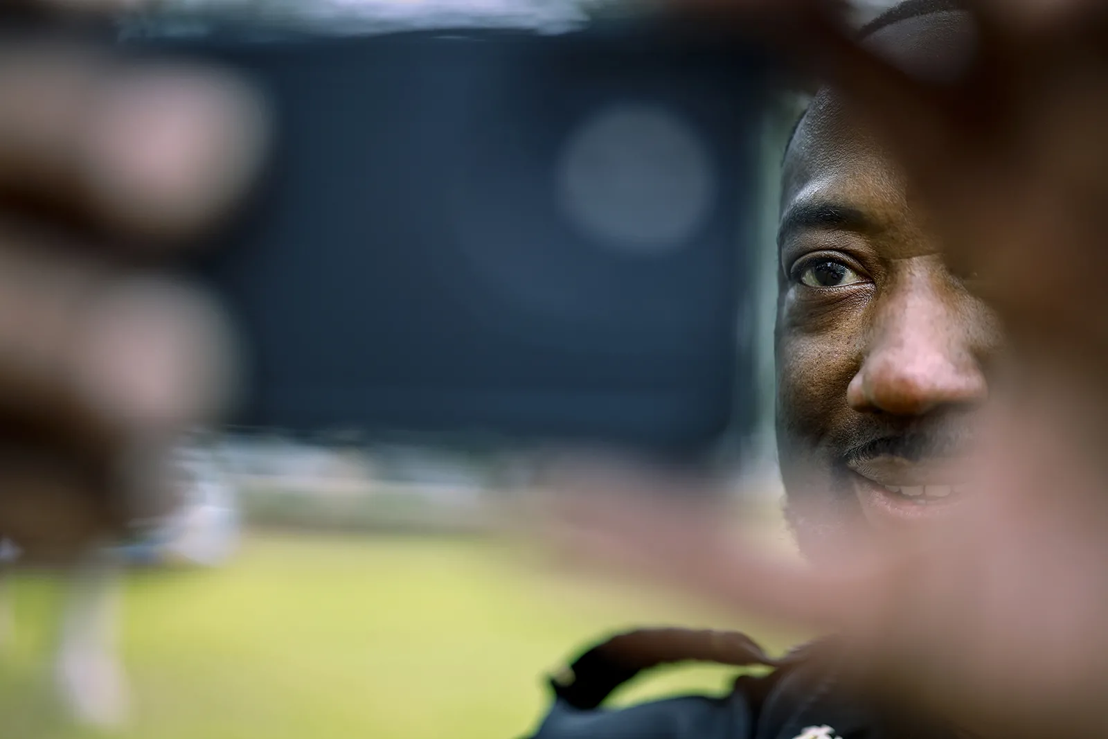 Lt. Roger Barnes uses his cell phone to document the condition of call boxes on campus.