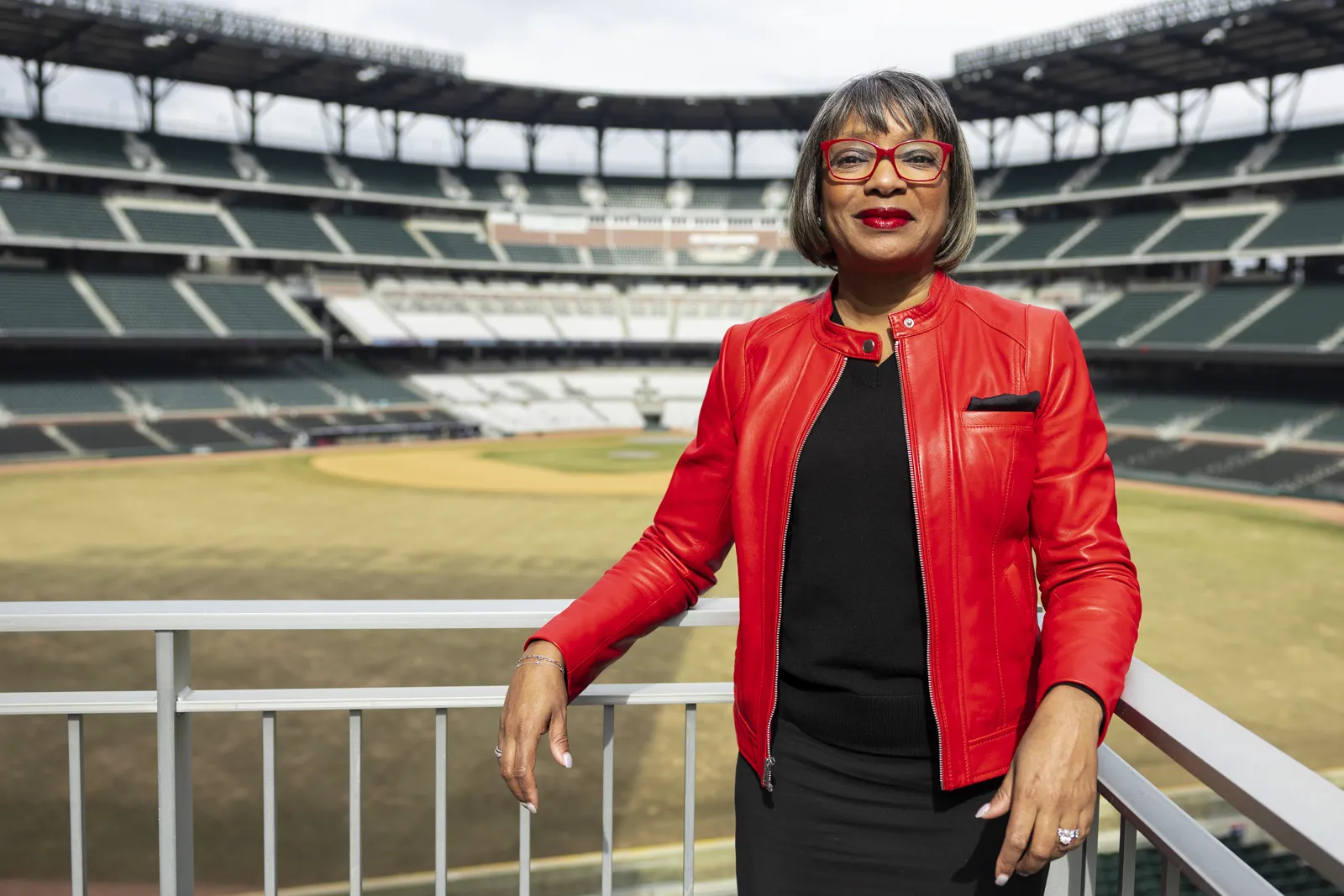 UGA alumnus DeRetta Rhodes, Executive Vice President/Chief People Capital Officer for the Braves, poses for a portrait at Truist Park in Atlanta.