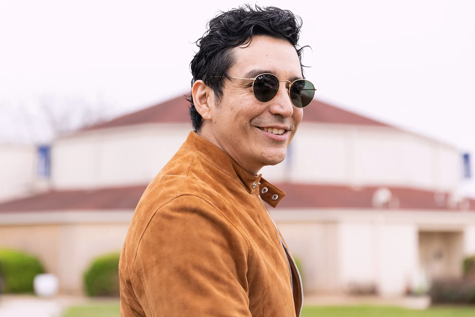 Gabriel Luna smiles as he films an Instagram story outside of the Mary Moody Northen Theatre before entering at St. Edward's University in Austin, Texas, on Friday, Feb. 24, 2023. Luna, a former student and star of HBO's hit series The Last of Us, visited his alma mater during Mary Moody Northen Theatre's Scholarship Audition Weekend.