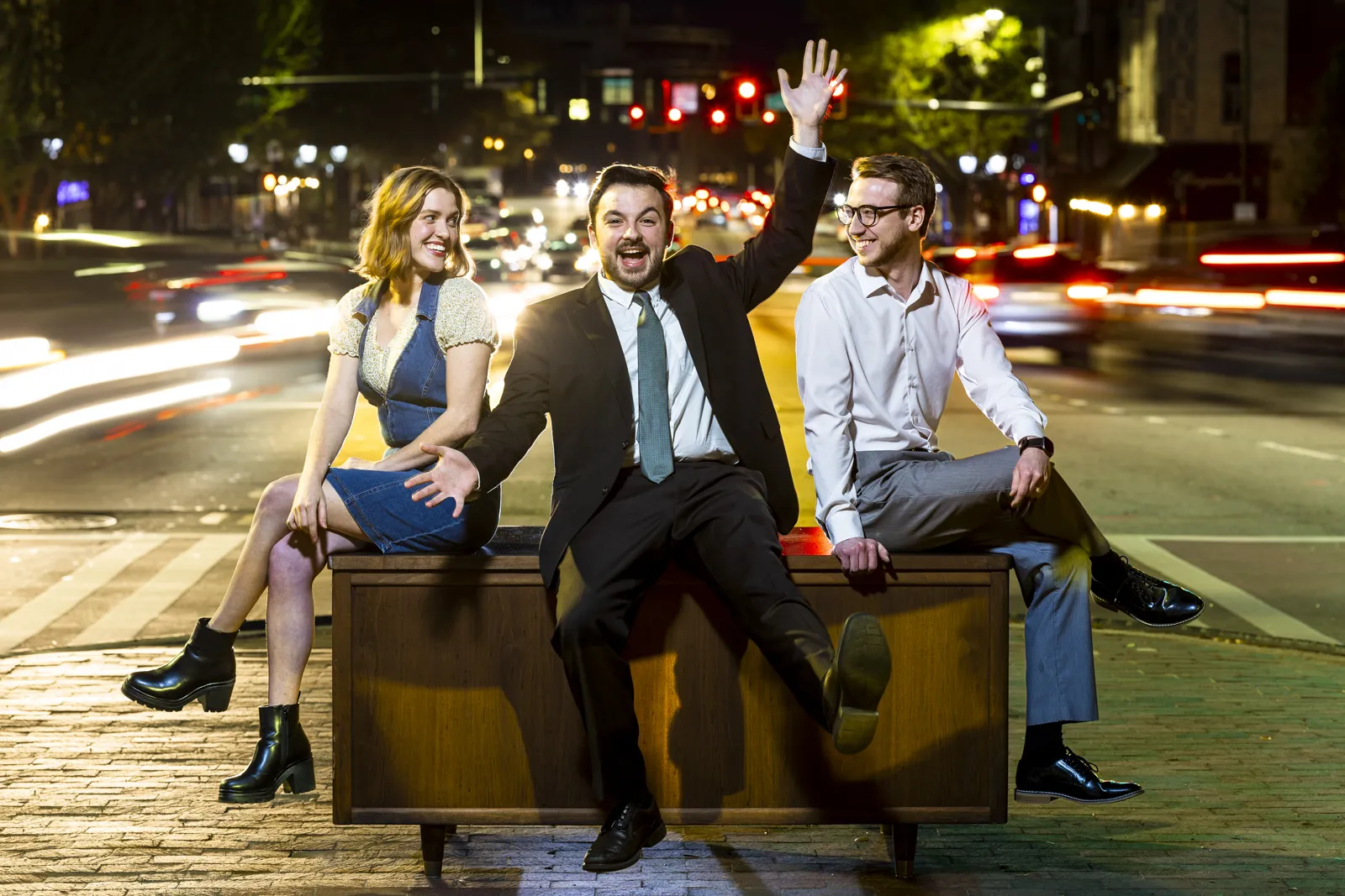 Sydney Wakeford, UGA alum and employ, Cam Kreitner, UGA student, and Keegan Westra, UGA alum, pose for a portrait on Broad Street in Downtown Athens. The group respectively stage manages, hosts, and produces a local live late night show, Late Night in Athens.