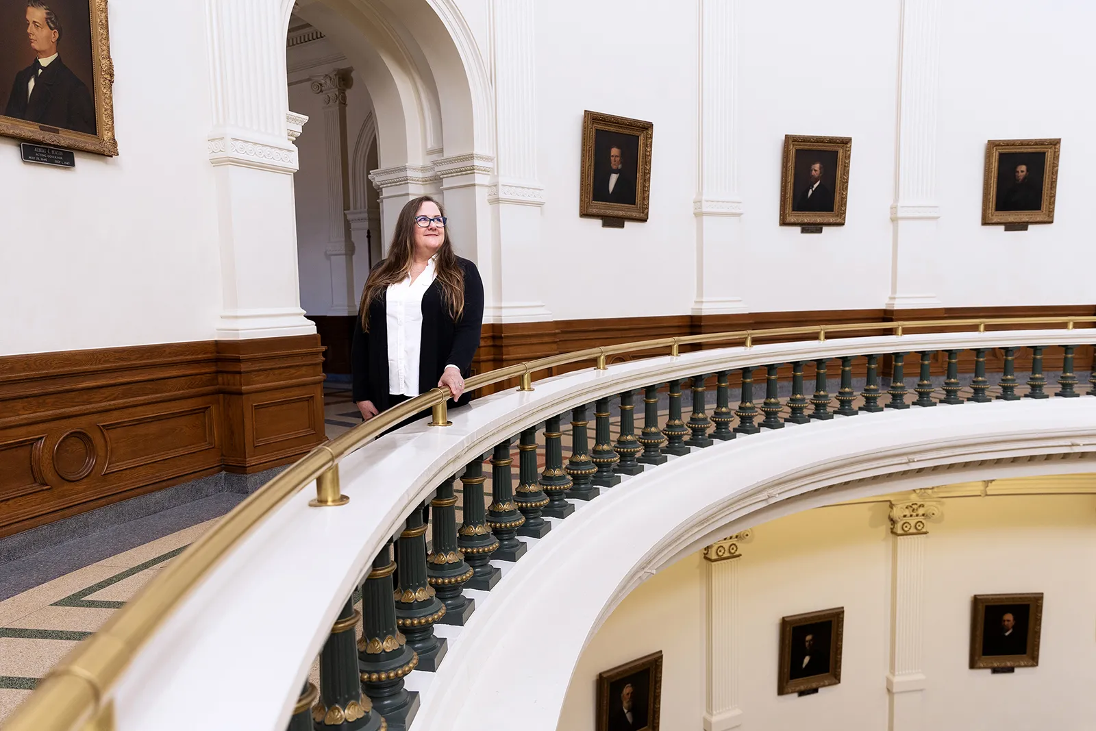 Leah Pinney stands in the Texas State Capitol rotunda on the opening day of the legislature in Austin, Texas on Tuesday, Feb. 10, 2023. Pinney is the executive director of the Texas Center for Justice and Equity. Pinney says, "In our advocacy at the State Capitol and on the ground in Texas cities, we are proud to partner with community members, fellow advocates, academics, service providers, and many others to transform justice. We are intent on ending mass incarceration: by reorienting the state’s criminal legal system toward prevention, healing, and redemption; by stemming further growth in an already bloated and ineffective system; and by fighting for investments in community-based supports that exist outside of the system. We want all Texans to feel safe, have hope, and succeed, and it takes each of us to make that vision possible."
