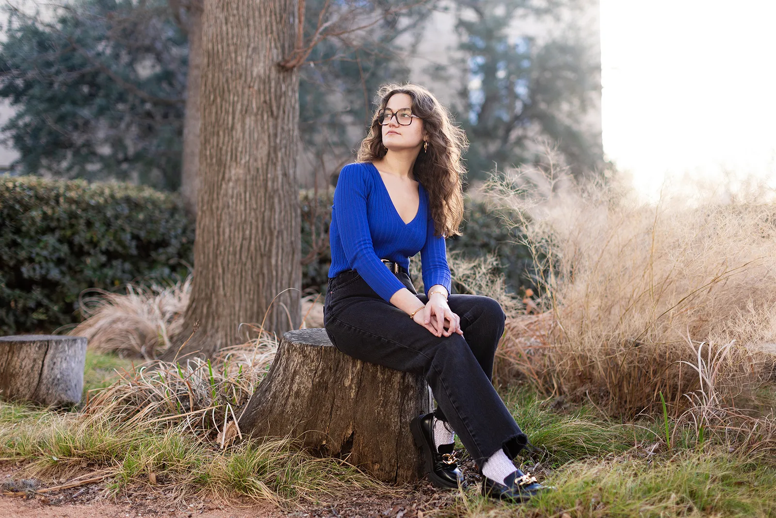 Gianna Ligotino sits on a tree stump in the Campus Ministry courtyard in Austin, Texas, on Wednesday, Jan. 18, 2023. Her thesis examines the philosophical and political context for two 19th-century realist art groups — the Macchiaioli of Italy and the Peredvizhniki of Russia. Although they were responding to different political realities, both used art to advocate for social change. With support from the Martin Scholars program, Ligotino spent two weeks in Florence and Rome, studying work by the Macchiaioli.