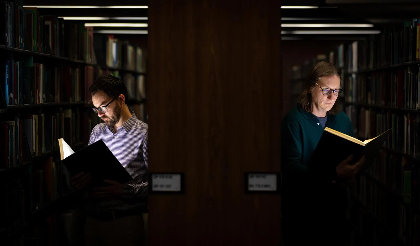 Two professors are photographed in the library for an article about the future of writing.