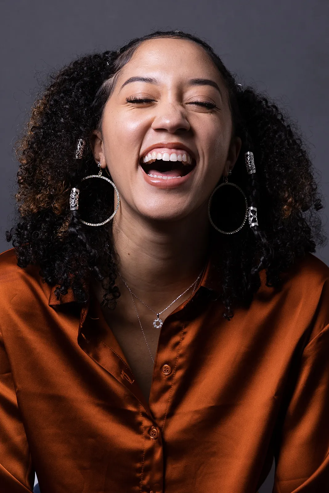 Alexis Reed laughs during a portrait session in Austin, Texas, on Friday, Jan. 27, 2023. Reed, a Sociology major (Gilman recipient), who was interviewed by sports journalist Dave Zirin for his latest book, The Kaepernick Effect, and was interviewed for a Showtime documentary about the history of Black athletes and protest. As the keynote speaker at the "Power to the People: Own Your Activism" event on campus, she spoke about her own activism as a high school senior, when, as the captain of her cheer team, she protested during the national anthem at every football game that year. Alexis was inspired by Colin Kaepernick’s protests against racial inequality and the oppression of people of color.