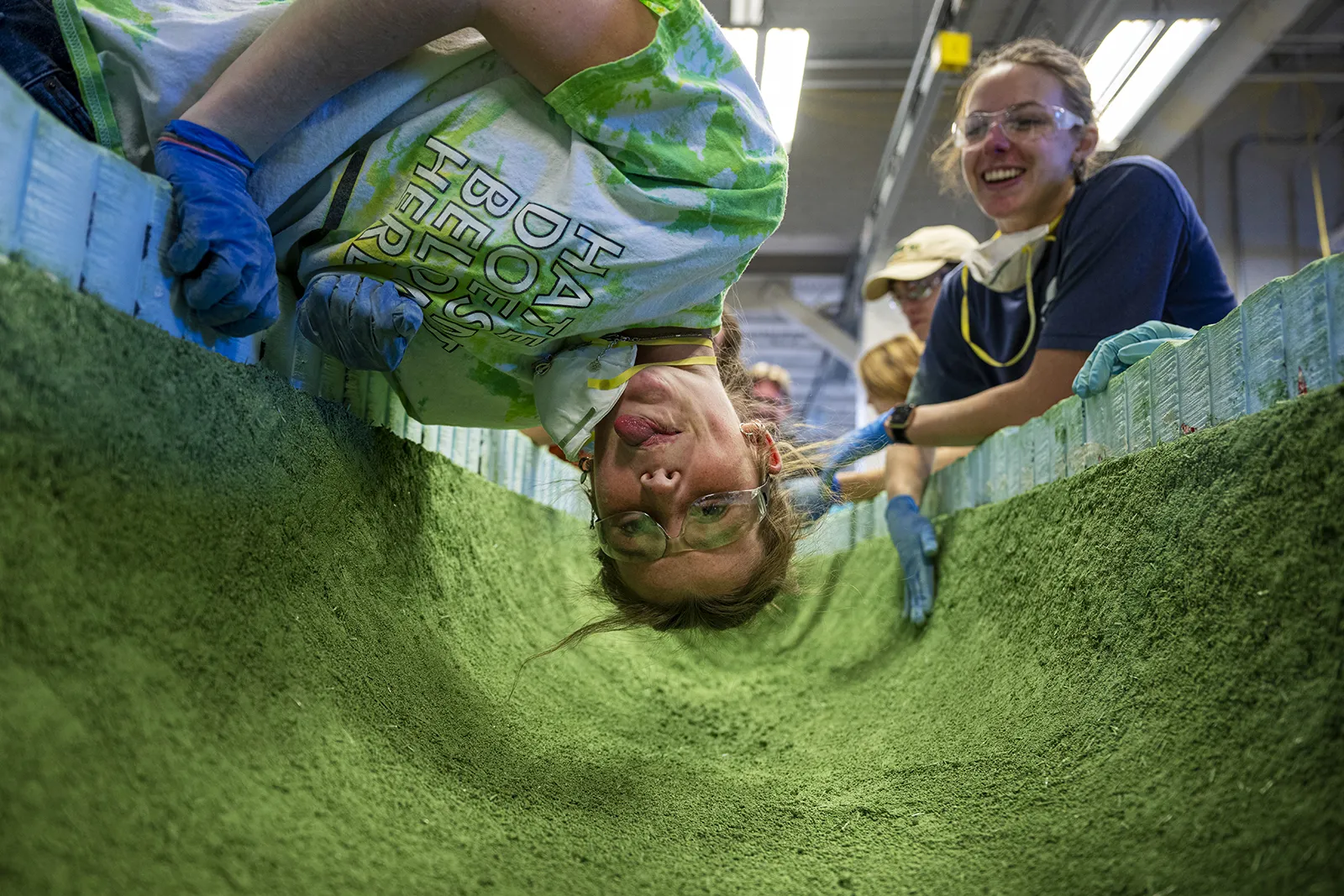 Members of the concrete canoe team pause for a moment of fun while forming the main structure.