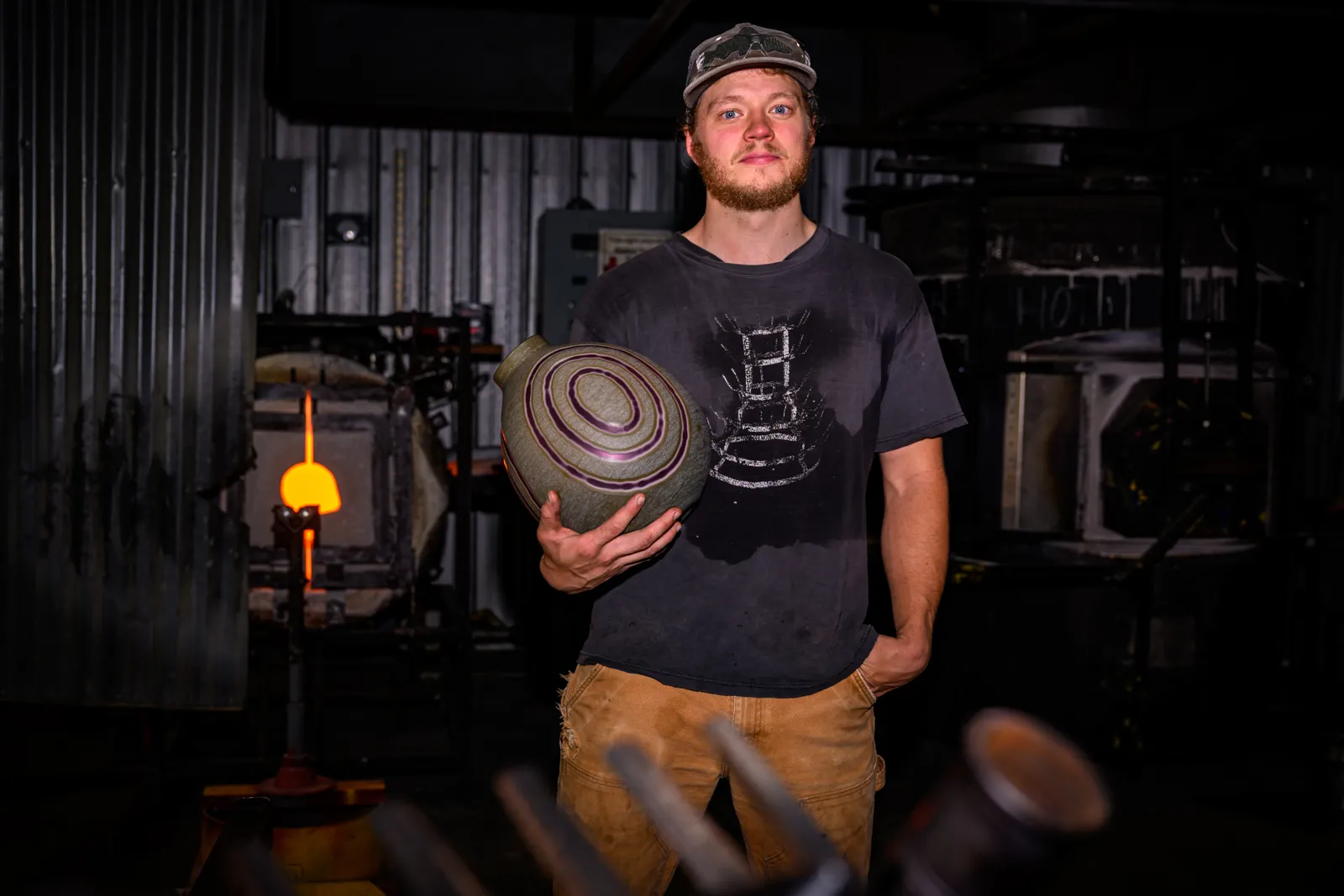 Cole Johnson, a WCU Alum in his glass blowing studio at Green Energy Park located in Jackson County, NC.