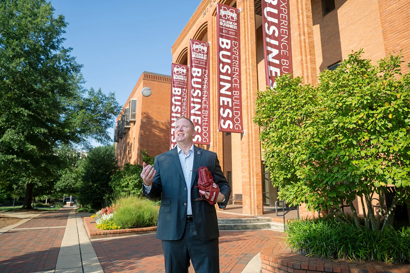 Photographed for MSU's Alumnus Magazine, Dr. Scott Grawe, once recruited to play baseball for the Bulldogs, pursued his pitching career at another university. However, a call out of the bullpen secured his spot on the roster as the Dean of MSU's College of Business. Now, he's making business pitches and creating out-of-the-park opportunities for MSU.
