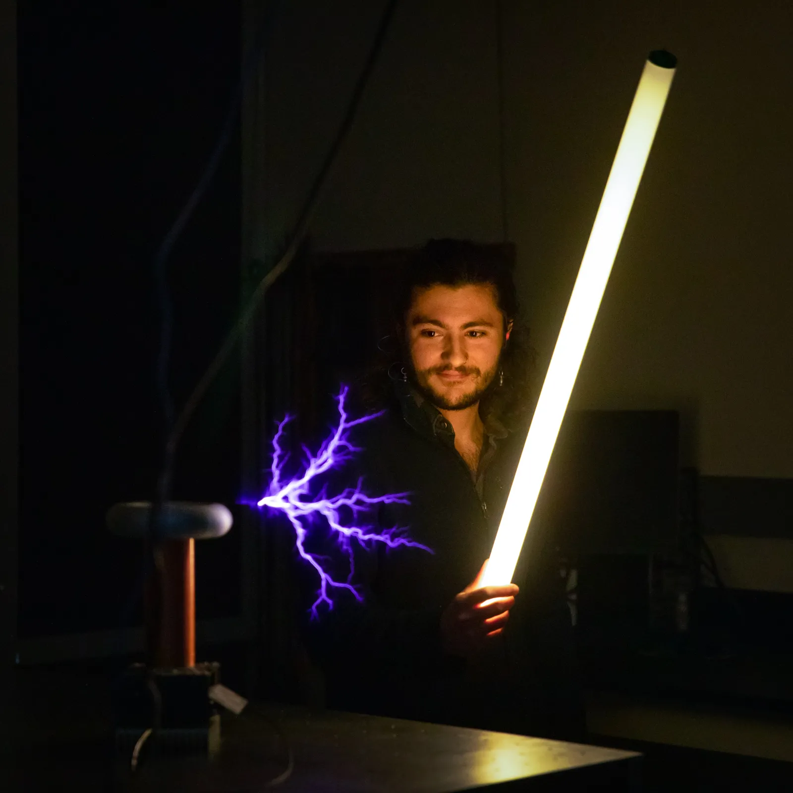 Experimental physics graduate student, Donny Davino, demonstrates a Tesla coil wirelessly powering a fluorescent lightbulb to Providence Public School students during a visit to campus. Davino also used the tesla coil to play songs including the Imperial March from Star Wars