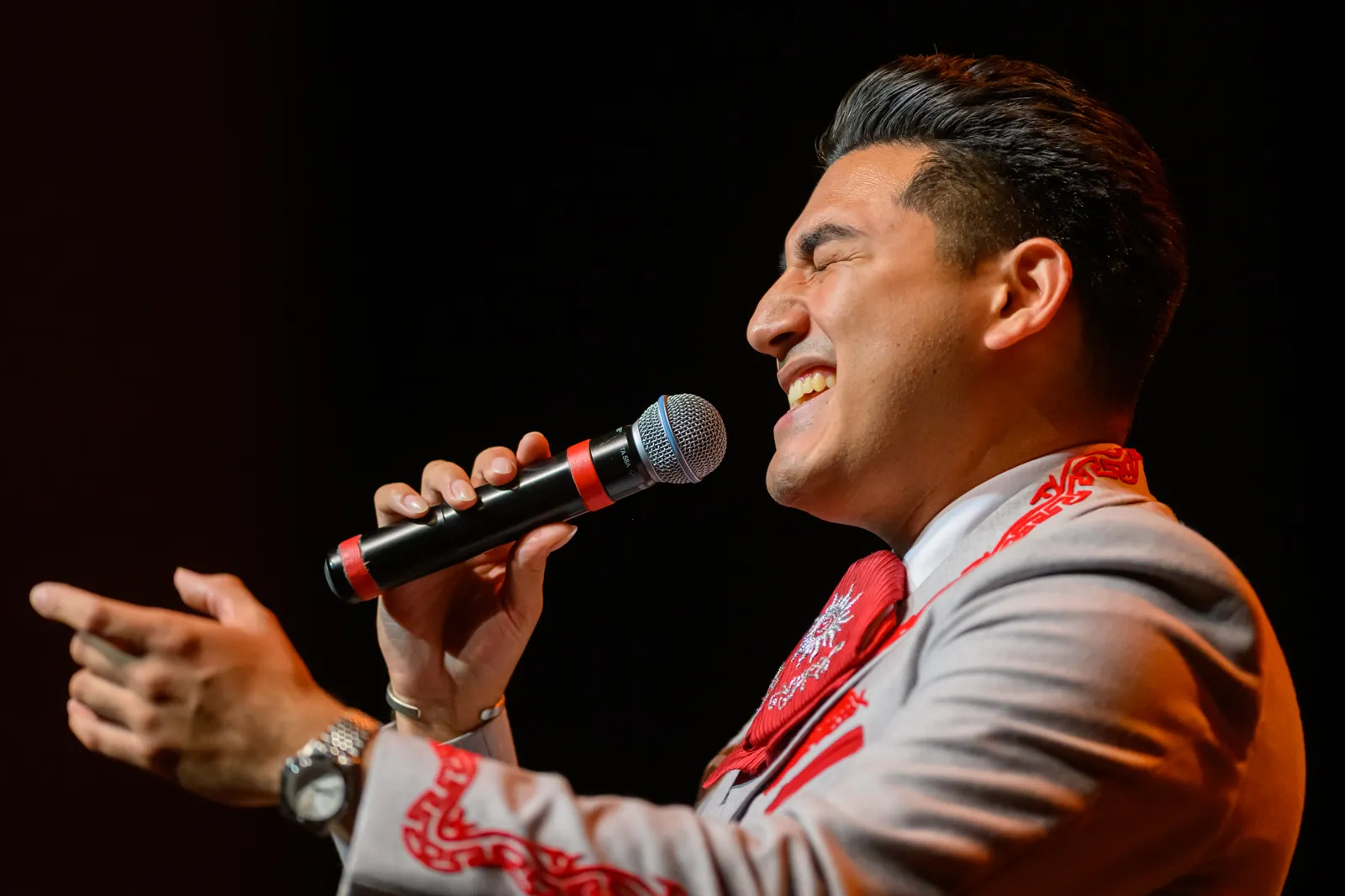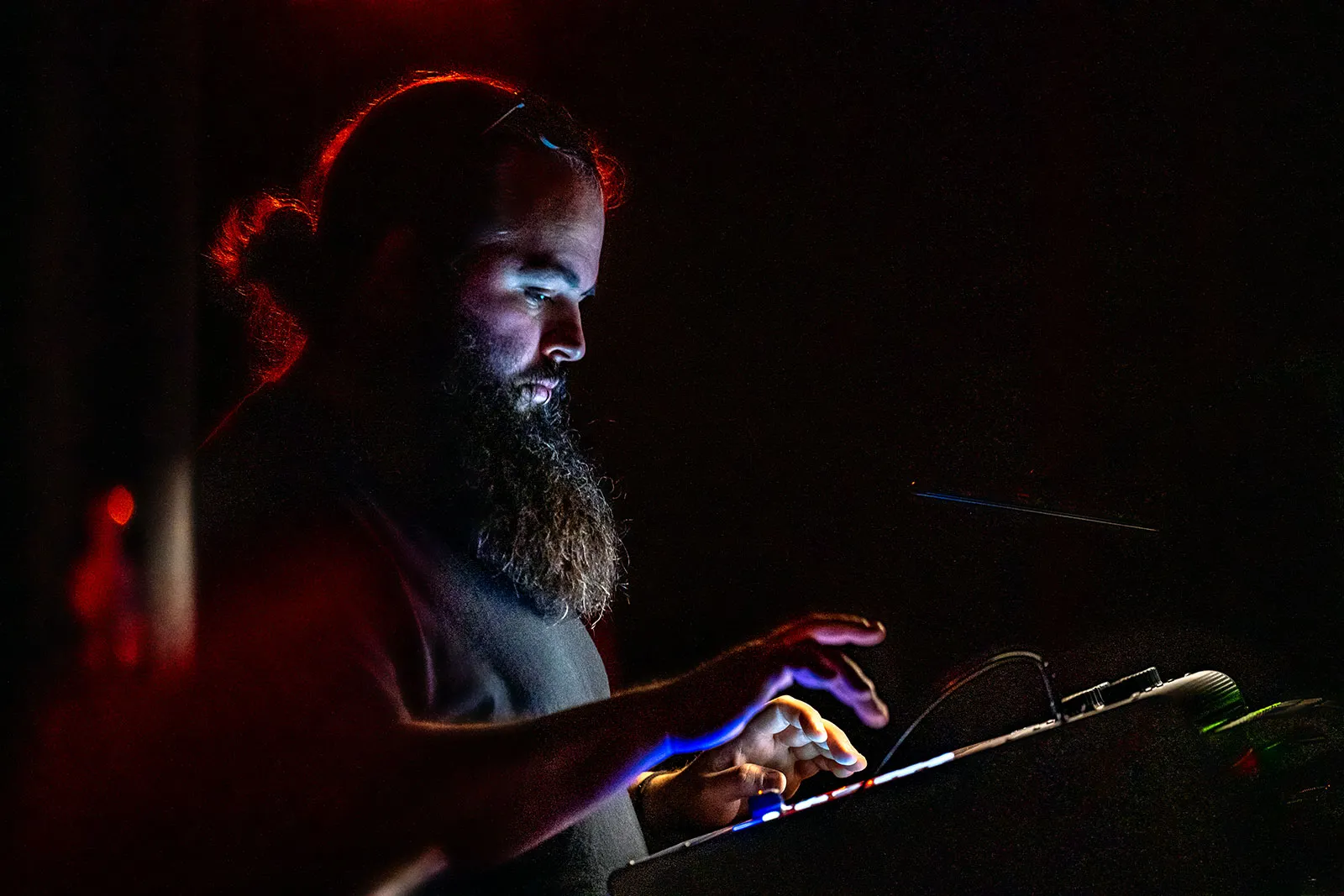 Travis Berkoski works the lighting and sound during an a cappella concert.