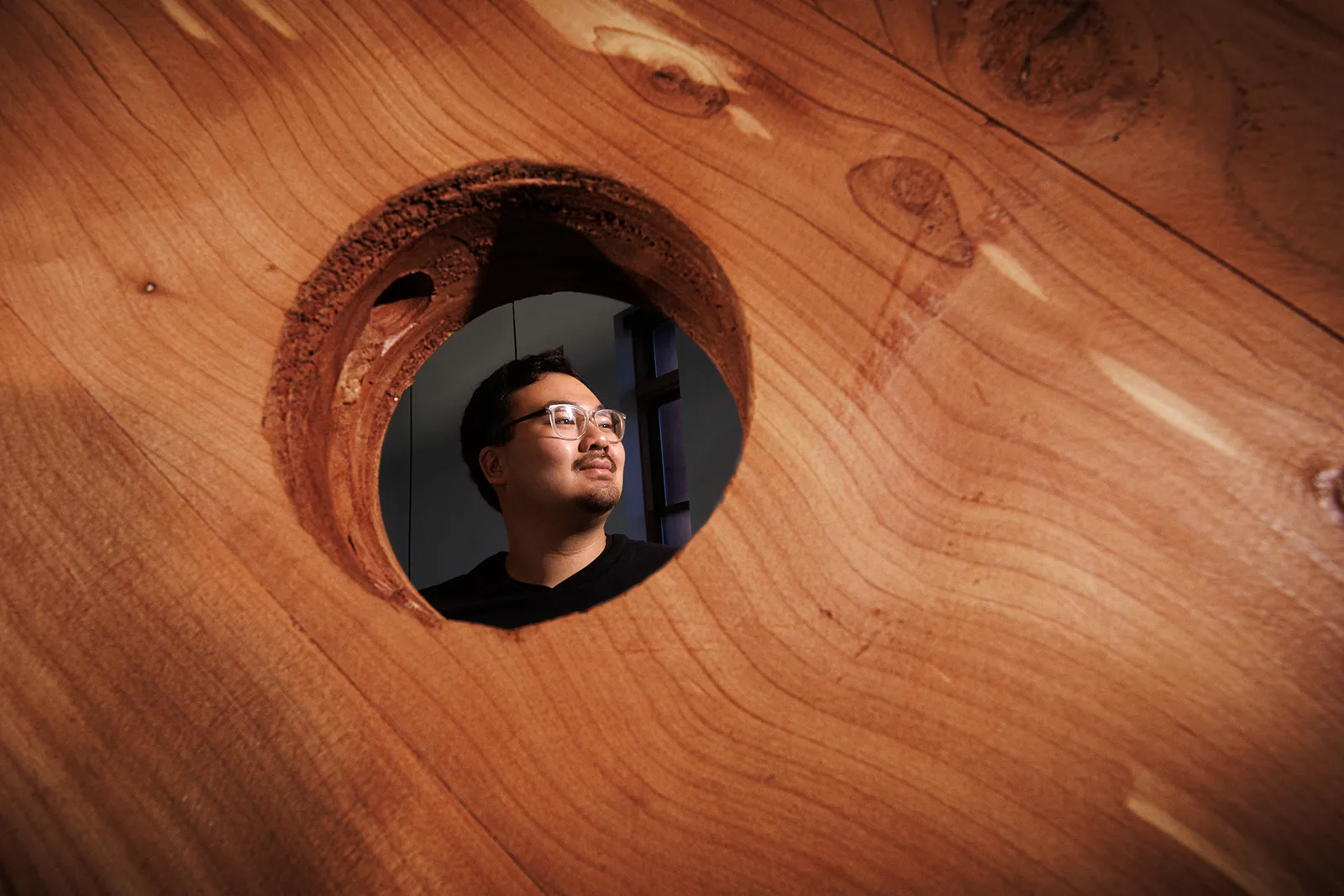 Chris Nguyen, a third-year architecture student from Grand Island, poses with one of his cedar panels. The panels are part of his project to find useful materials from the invasive Eastern Red Cedar tree. Nguyen spent the summer in western Nebraska cutting down the trees and turning them into planks.