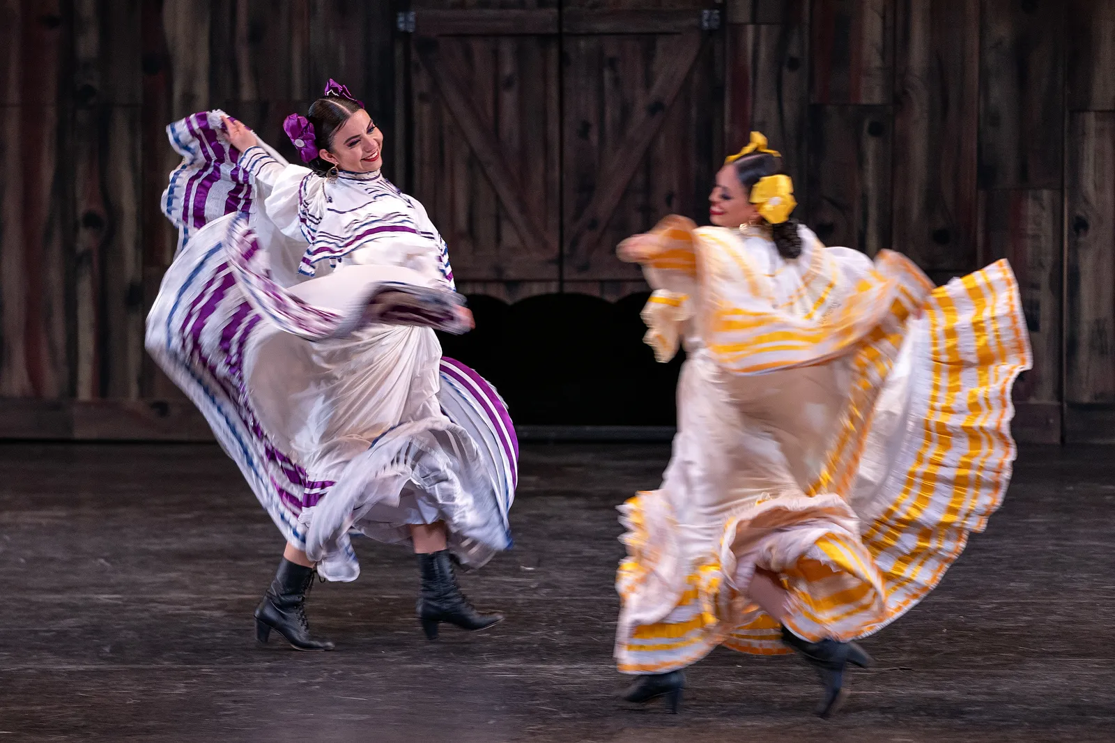 A pair of ballet folklorico dancers performing during an arts & literacy festival.