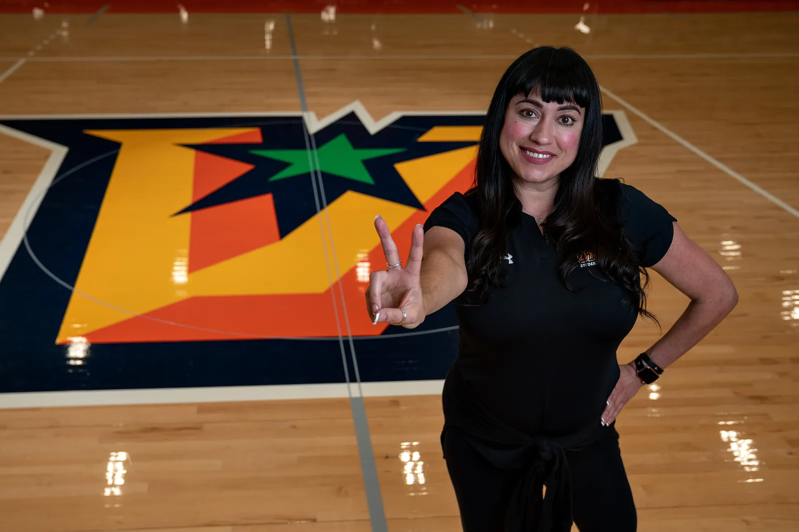 Portrait with the university hand sign for a story on the new spirit coach and expansion of the program.