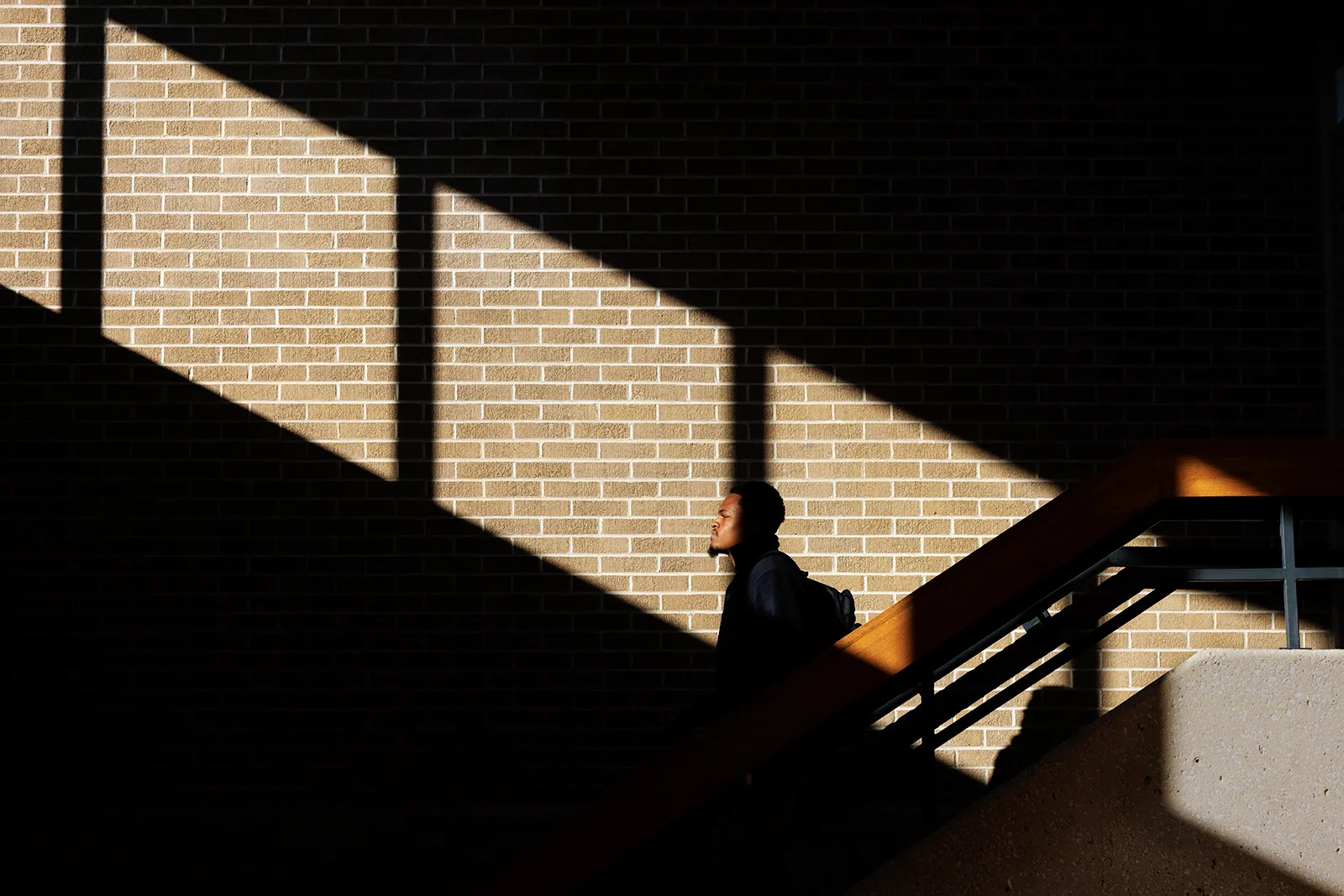 Dezhaun Artis, a first year law student from Atlanta, walks down the stairs in the law college library.