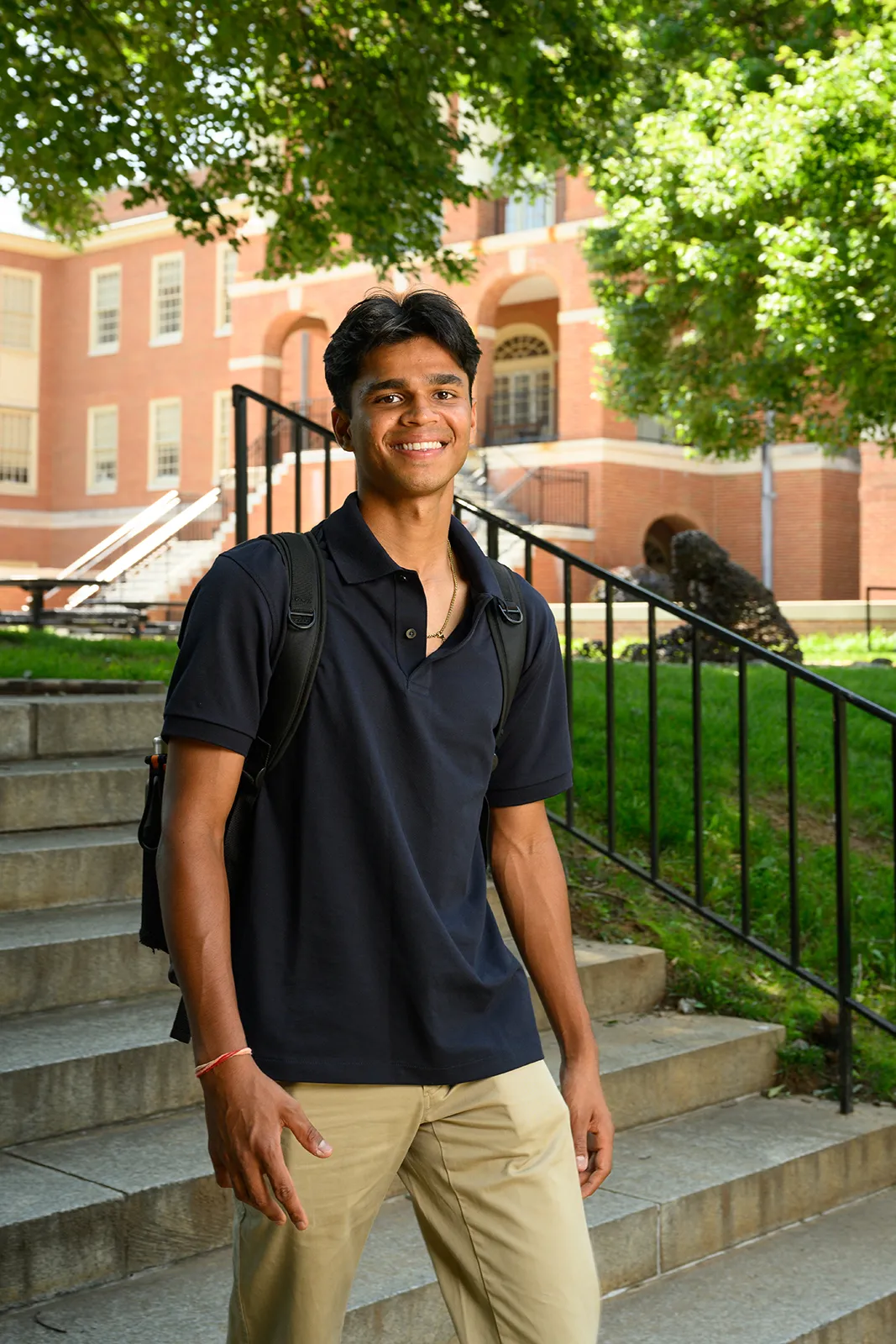 A student poses for portraits in a courtyard on campus for the next Admission's Viewbook.