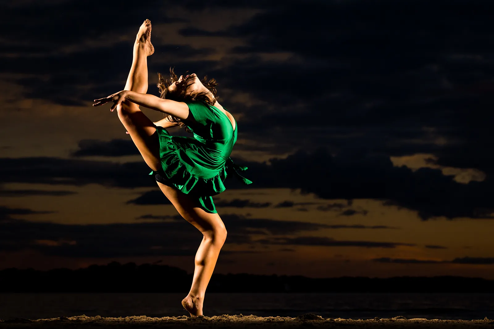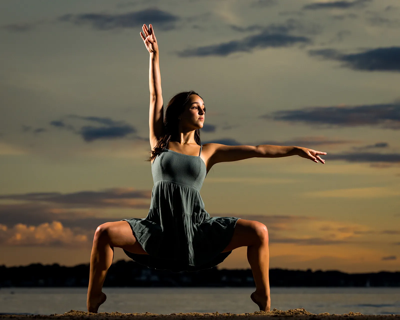 Sophomore dancer Emma Cummings performs a pique back attitude on forced arch, on Tupper Beach, during a portrait shoot