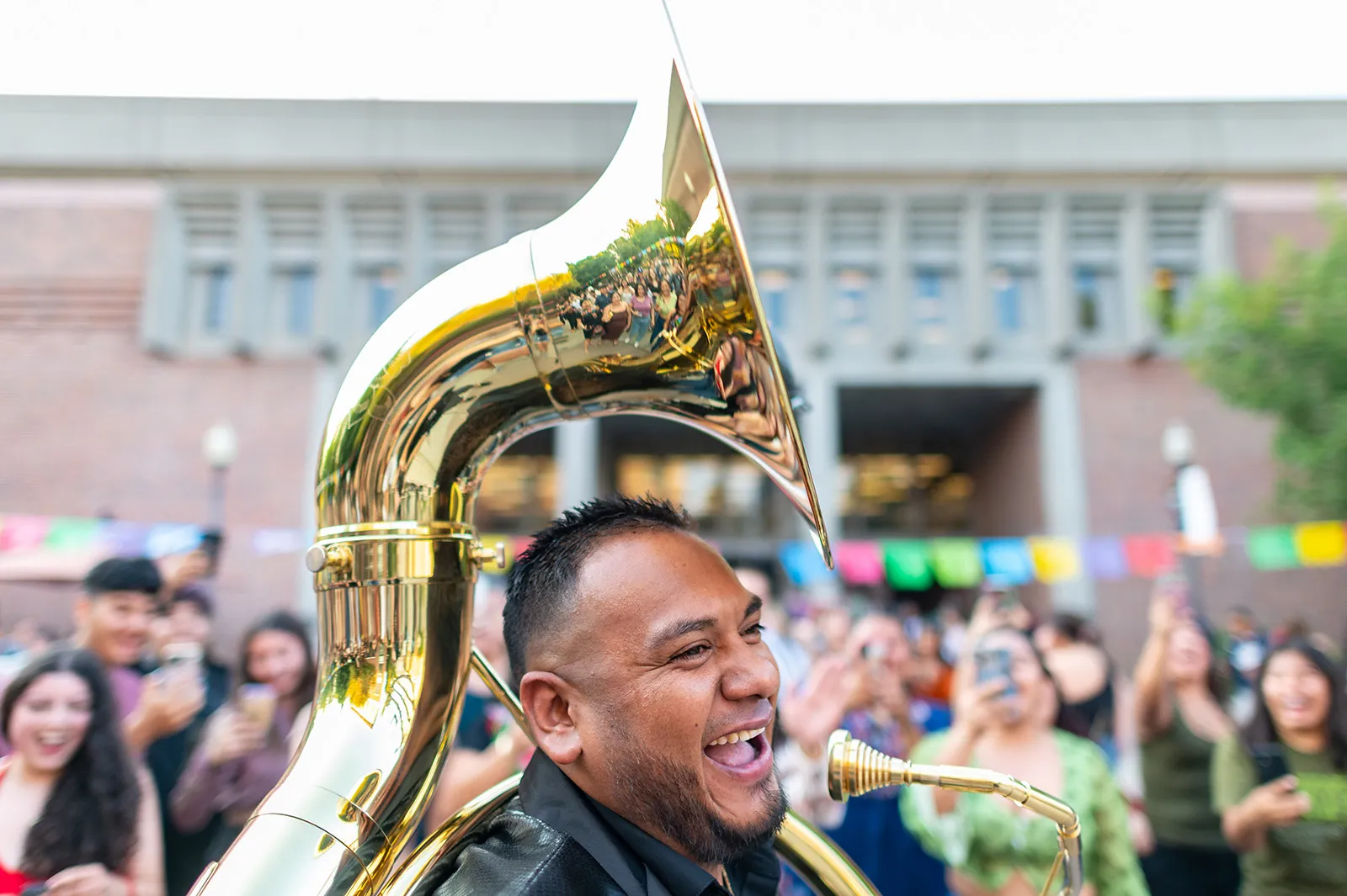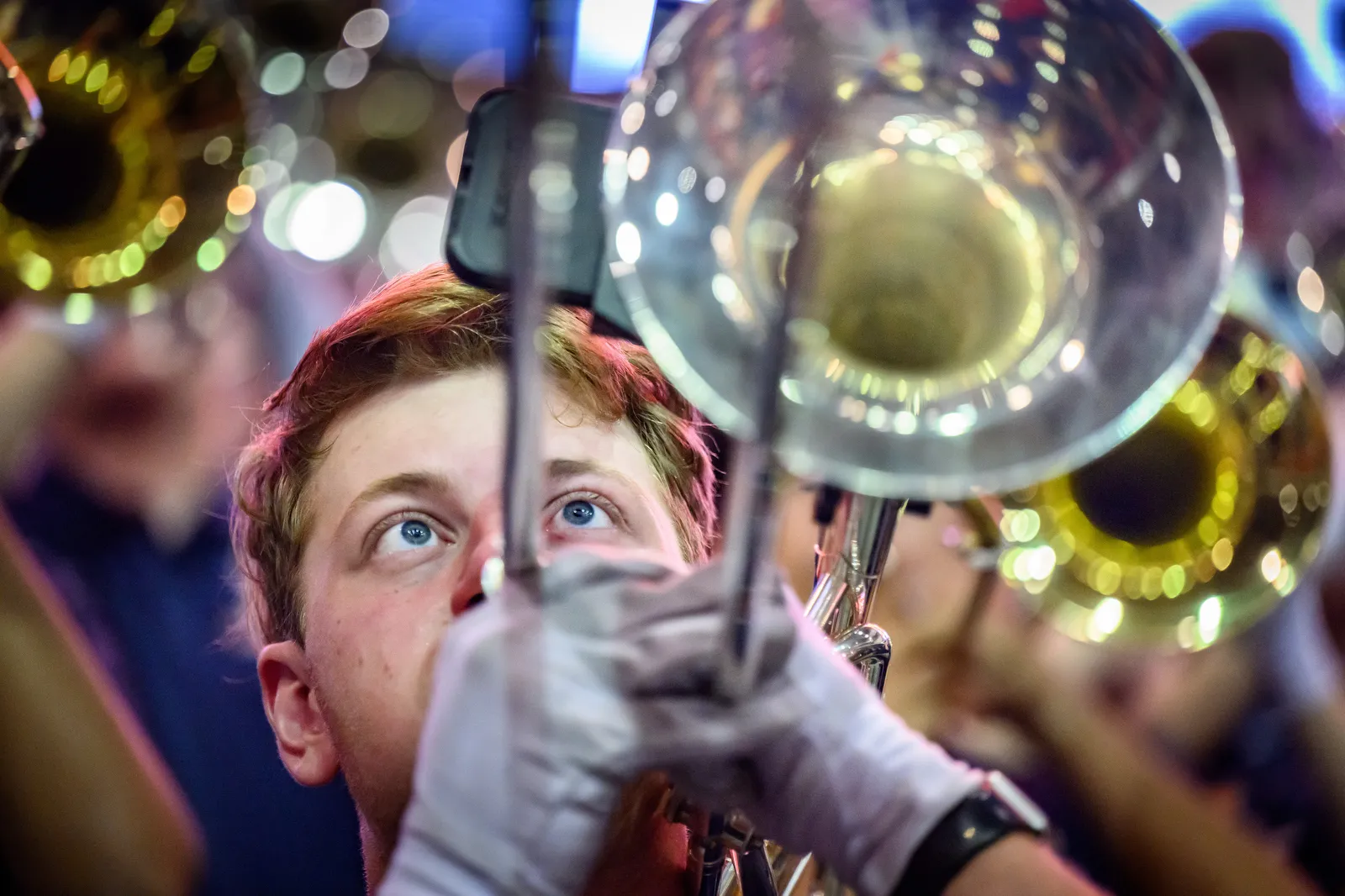 Swaying back and forth with the trombone line, this player in the volleyball band keeps his eyes locked in on the musical score. The entire band uses cell phones clamped to their instruments for all of their music.