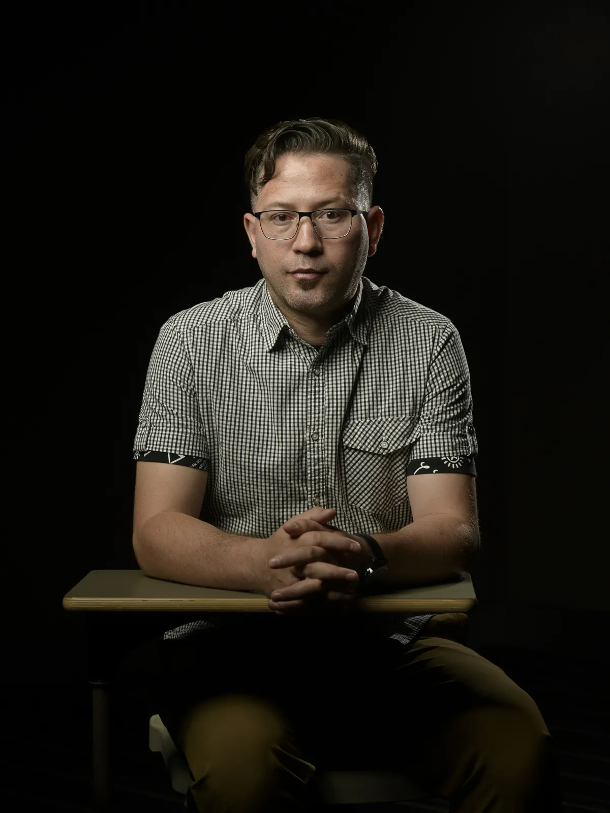 Sayed Ali Reza Ahmadi of Afghanistan, a doctoral student in the English Department at Indiana University of Pennsylvania, sits for a portrait on August 16, 2022. Ali was photographed for a university-published article, “Home Is Where the Mind Is: Supporting Students from Countries in Crisis”.