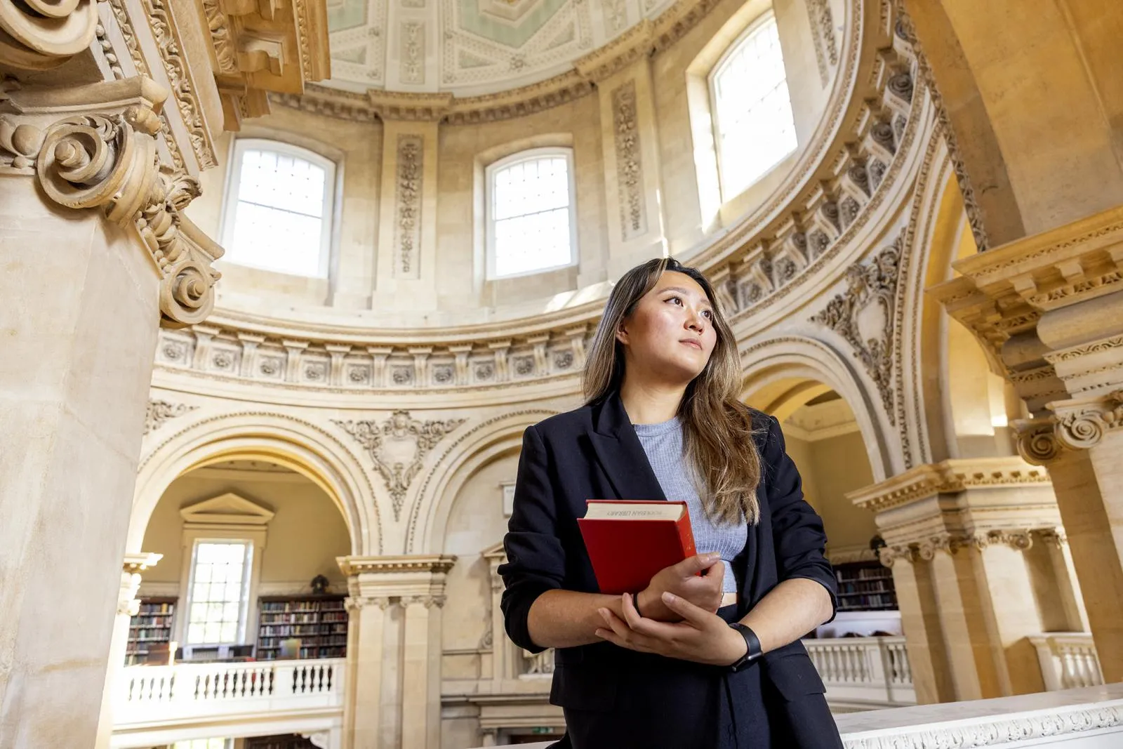 Undergraduate student Amy Nguyen poses for a portrait inside the Radcliffe Science Library during her summer term in the UGA at Oxford program.