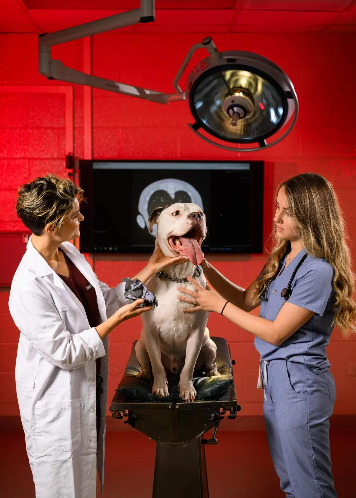 Assistant Professor of Soft Tissue and Oncologic Surgery Marine Traverson shows a 3D printed surgical cut guide to fourth year DVM student Abby Cox in a posed portrait.