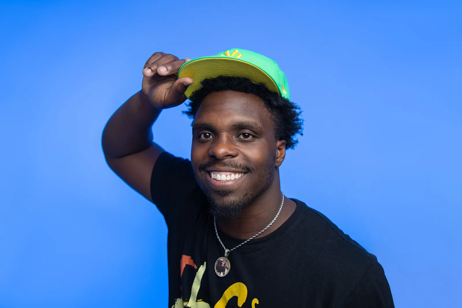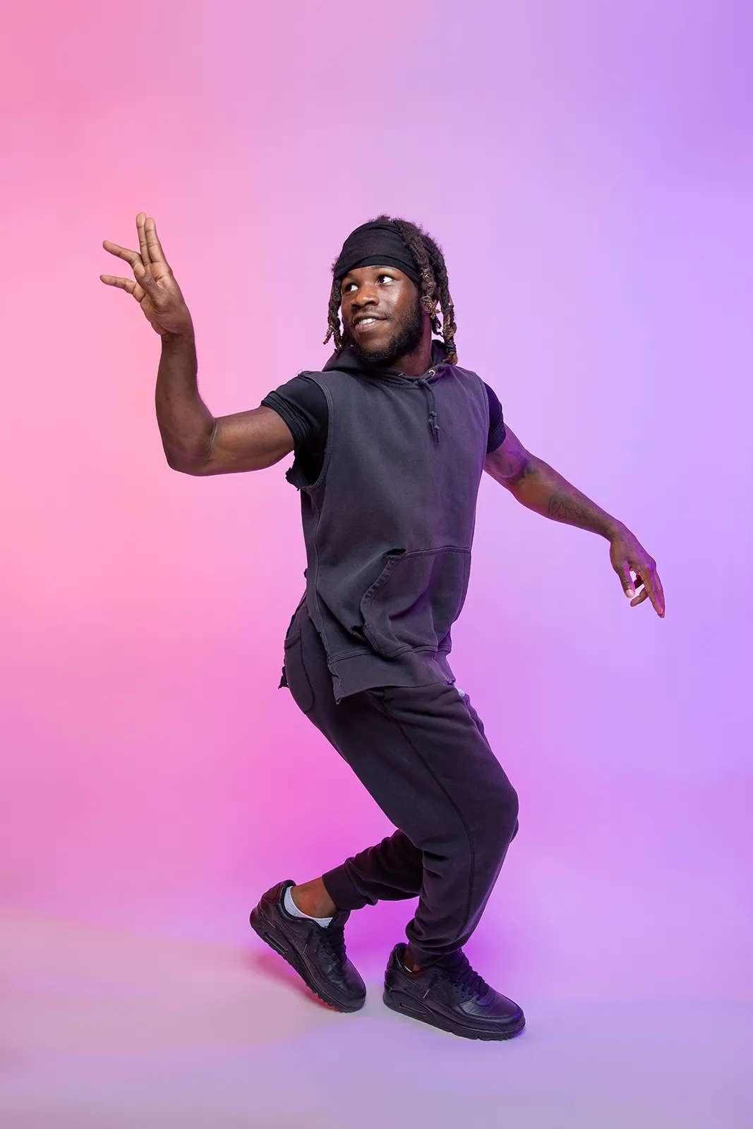 Football player Antoine Davis Jr. dances during his studio portrait session for the Define You 2022-2023 Athletics Campaign.