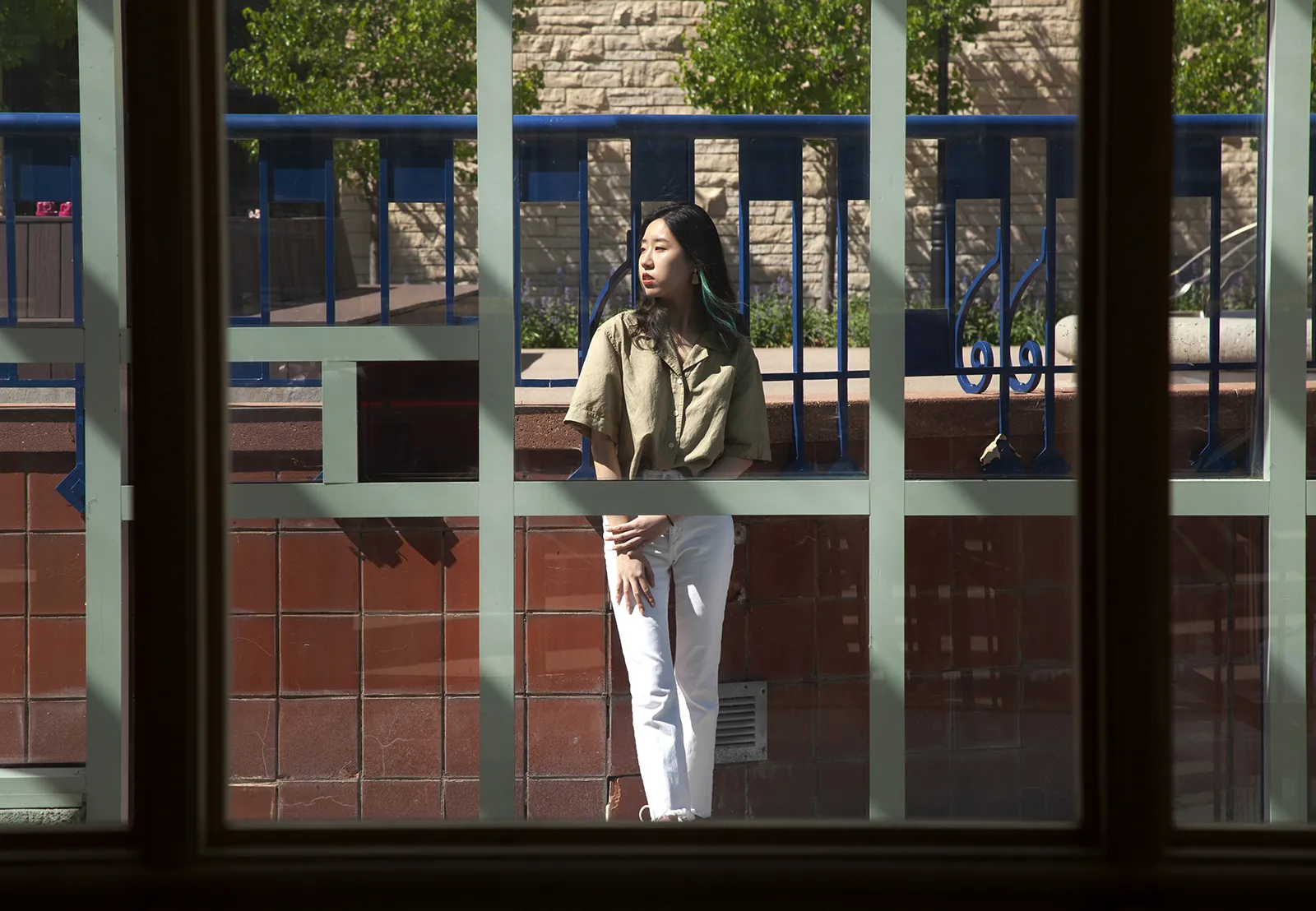 Jin Han, a junior, stands for a portrait outside the Wriston Art Center June 1, 2022. Han is publishing a book chapter with Brigid Vance, associate professor of history, based on their work tracing the history of some of the Wriston Art Galleries' East Asian artifacts.