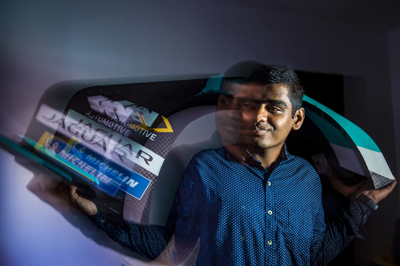 Omkar Ligude, a master's student in engineering, poses for a portrait at his Roxbury apartment with the Jaguar fender of a Formula E race car on Monday, August 1, 2022 that he was given after volunteering as a flagging and communications marshall at the July 16 NYC E-Prix. Ligude led an undergraduate team in India that built three EVs from scratch. Ligade was stationed at turn 4 when the Jaguar crash happened due to a sudden rain storm. Ligade fell in love with the sport as a mechanical engineering graduate at Pimpri Chinchwad College of Engineering in his native India, where in 2016 he co-founded Team Solarium, a student club that designed and built an electric car annually over three years.