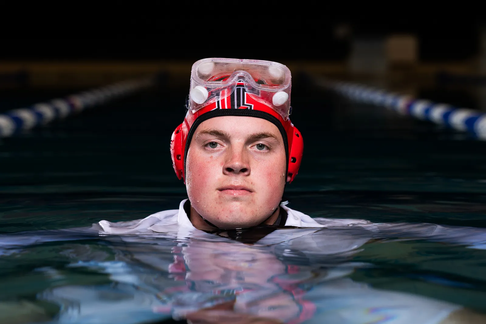 Chemical Engineering student and water polo team member Cavan Cox wears his lab coat, goggles and waterpolo cap in the University Recreation Center pool.