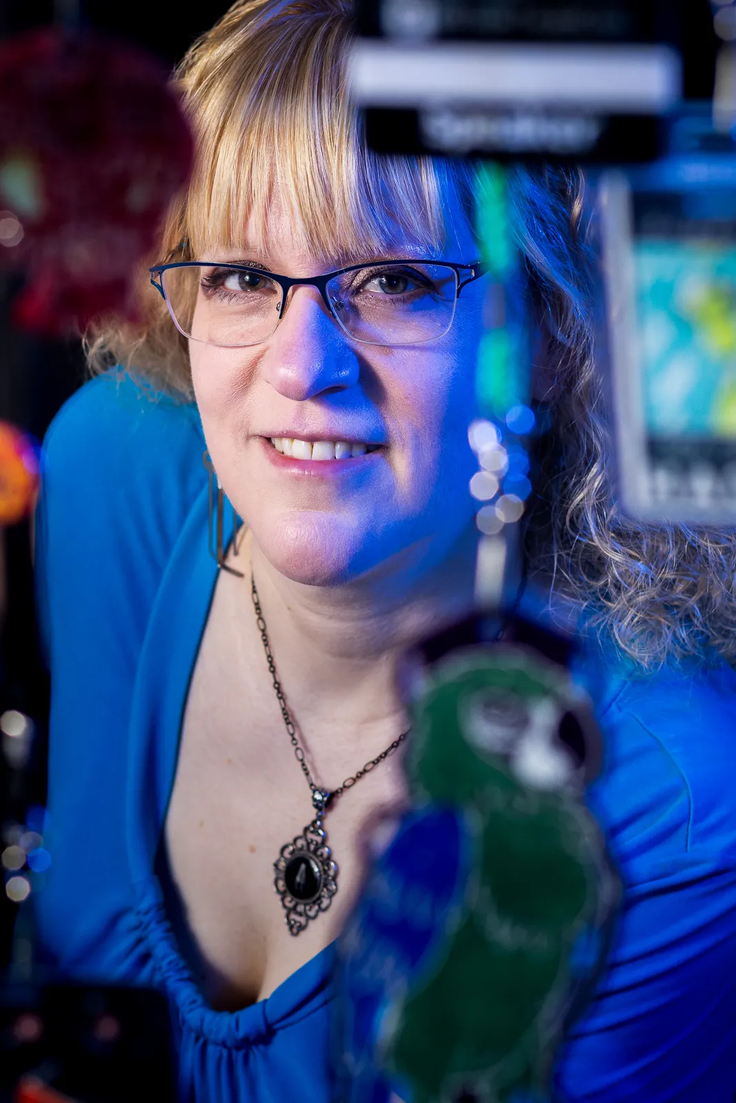 Cybersecurity expert Catherine Ullman poses for a portrait with a several of her previous conference badges in a studio setting in July 2025.