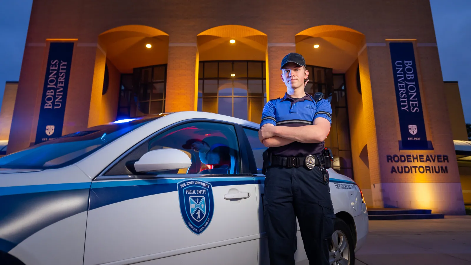 Portrait of student Public Safety Officer Ryan Van Leuven in front of the iconic Rodeheaver Auditorium.