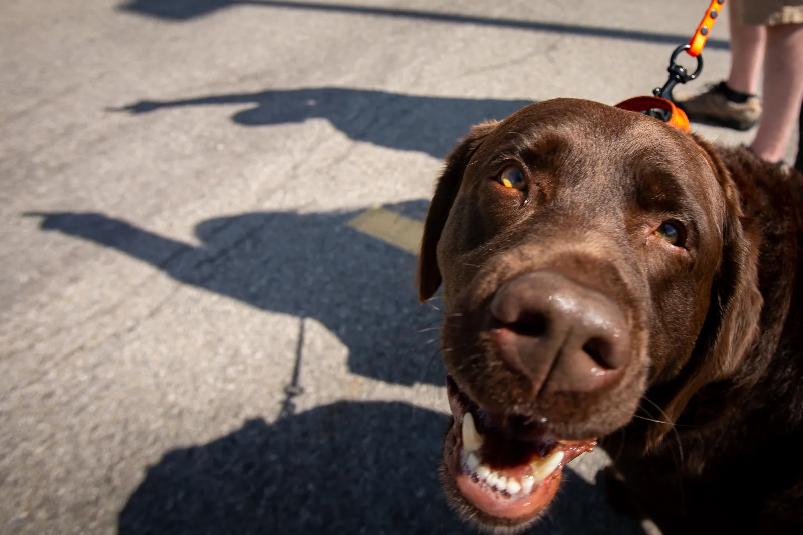 Maverick waits while his handler, MaryJo Bedford (left shadow) and Nose Work instructor DJ Rehberg (right shadow) discuss the task ahead.