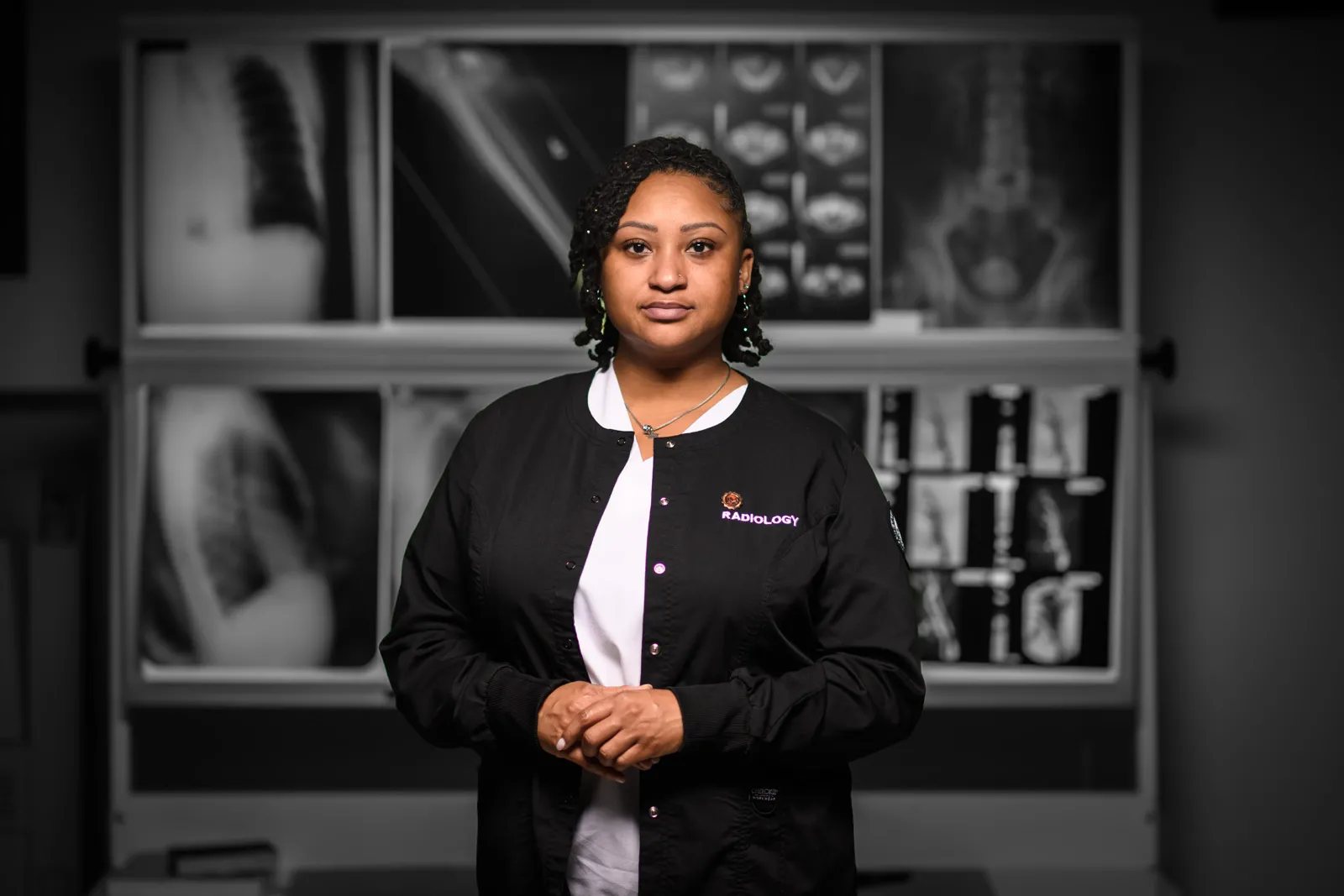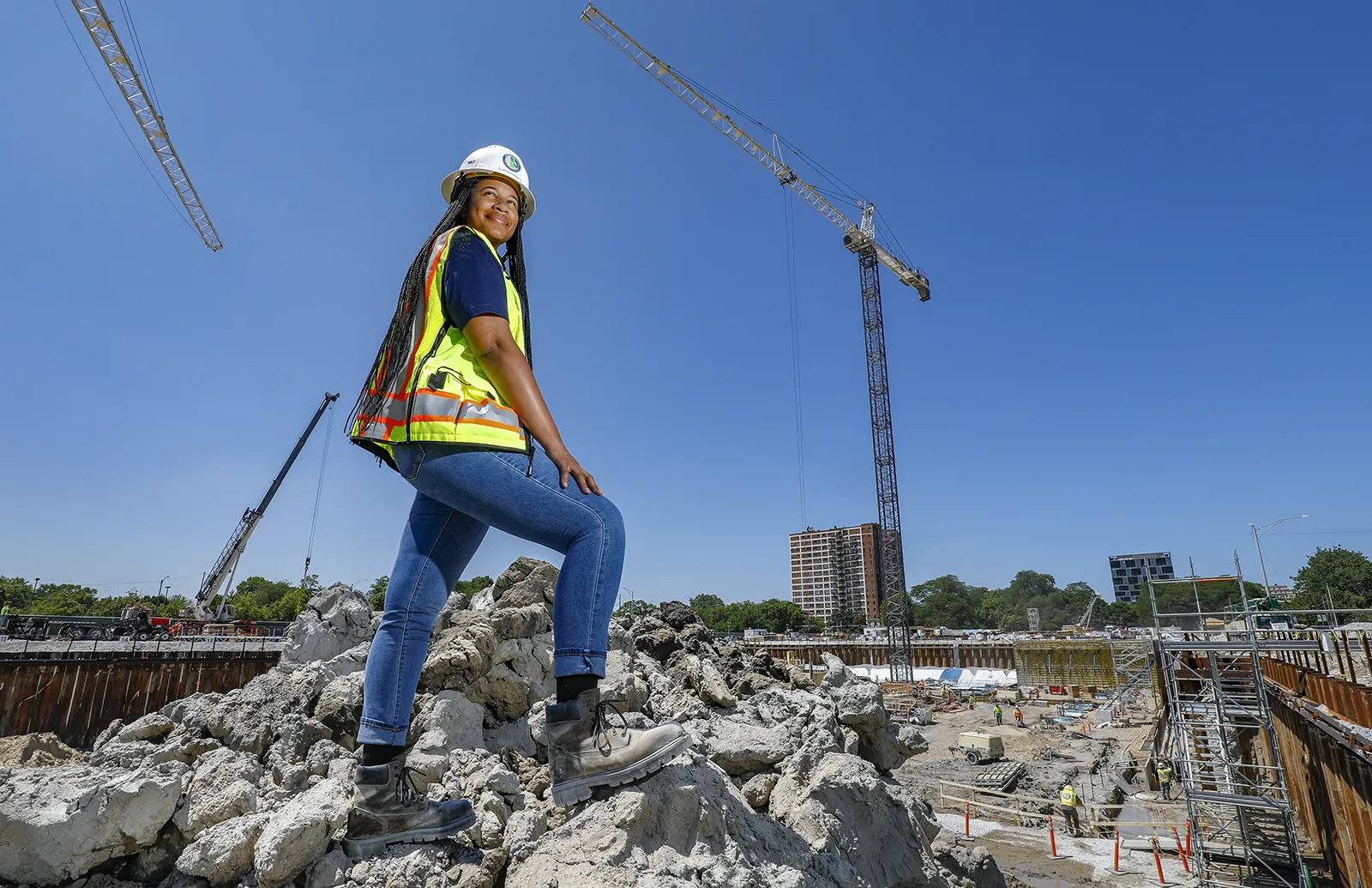 Portrait of University of Illinois Chicago College of Engineering MS student in Construction Engineering & Management in CME Kristen Moore at the construction site for the Obama Library, June 27, 2022.