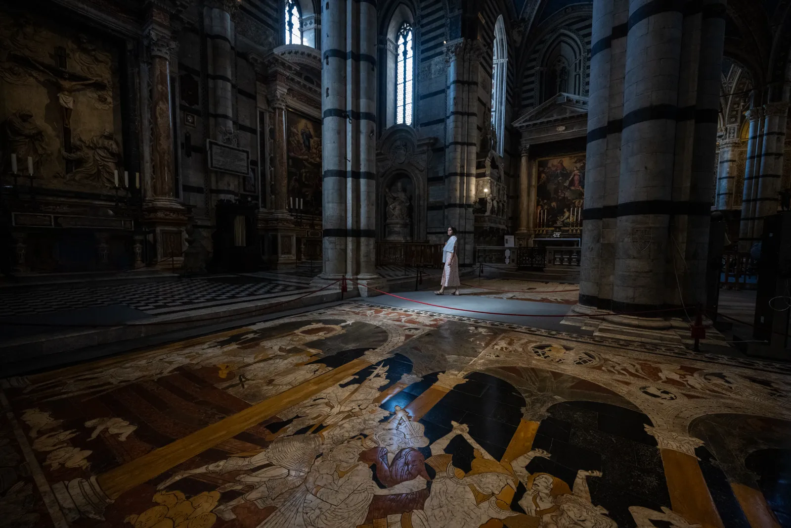 A woman passes under a ray of light streaming through a window in the Duomo di Siena Cathedral in Siena, Italy.