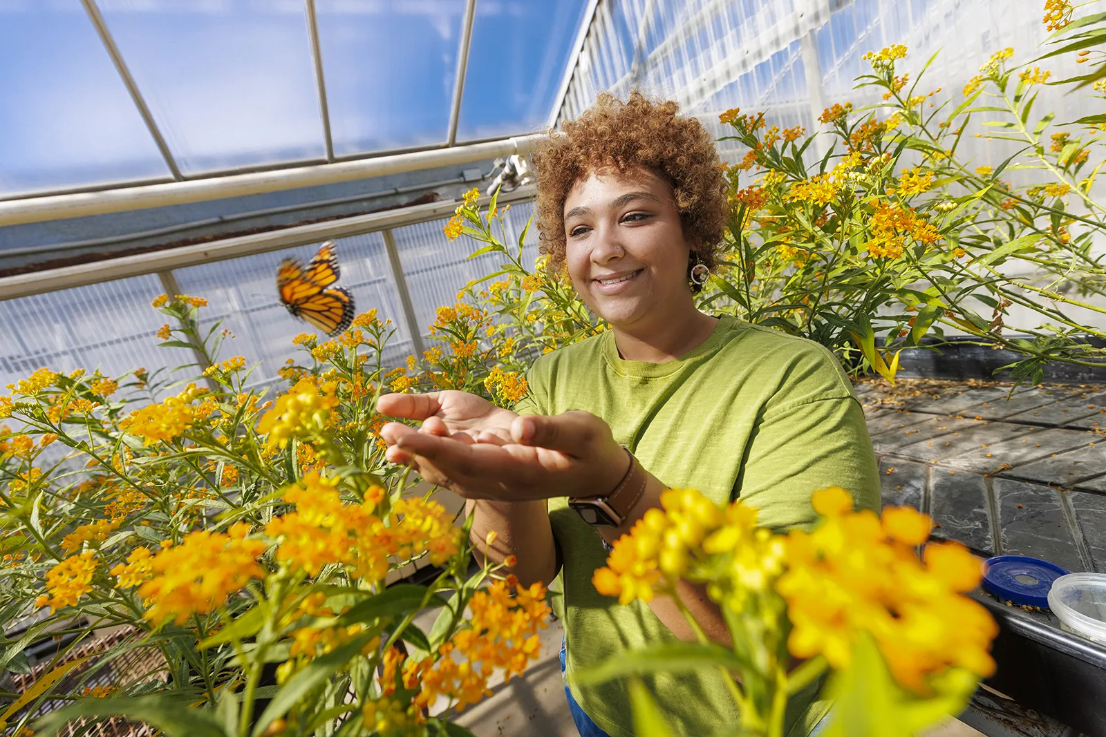 A Monarch butterfly flies out of Miyauna Incarnato’s hand in an east campus greenhouse full of tropical milkweed. Incarnato is a graduate student in entomology studying pesticides effect on Monarch butterflies.
